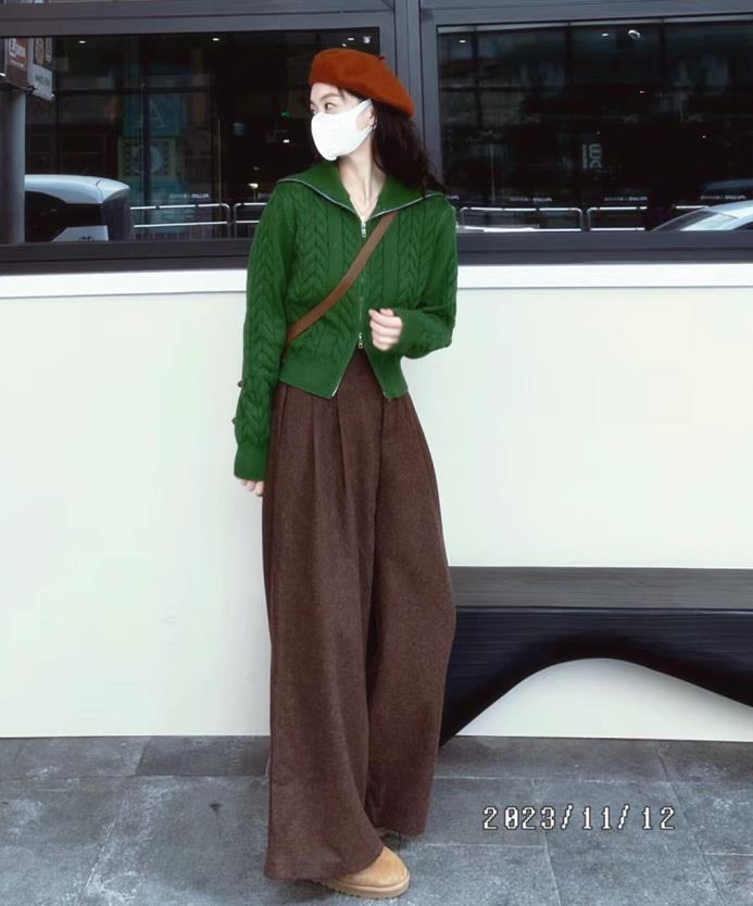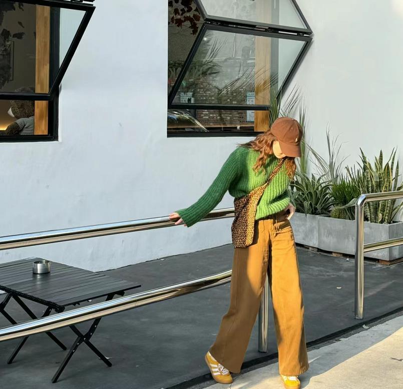 身材比例不夠,穿搭來湊,但凡有完美一點的身材,也不至於要靠搭配來加分,這一身的綠+咖配色太好看了。這樣的撞色就是能讓人眼前一亮,綠色小開衫+咖色休閒闊腿褲,顯瘦又藏肉。