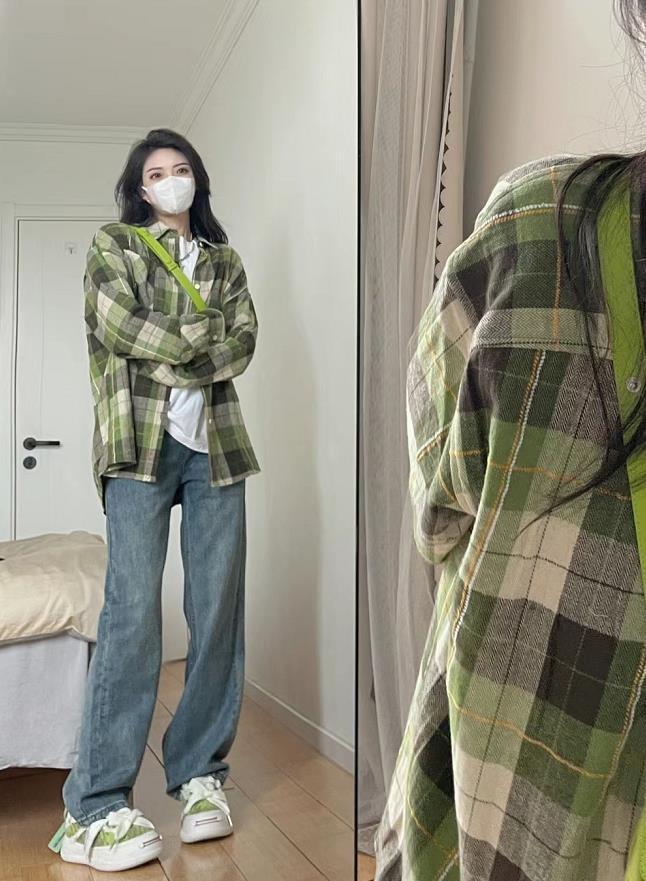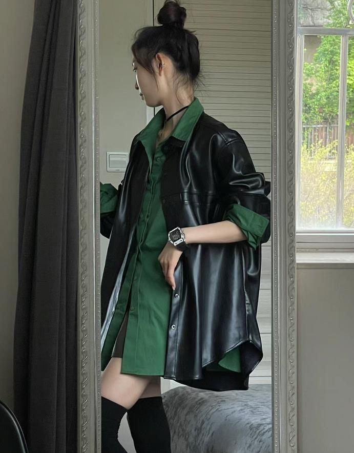 黑色皮衣和綠襯衫的搭配,也太酷太洋氣了,都是寬鬆的版型,給人舒適自在感,又十分顯瘦藏肉。