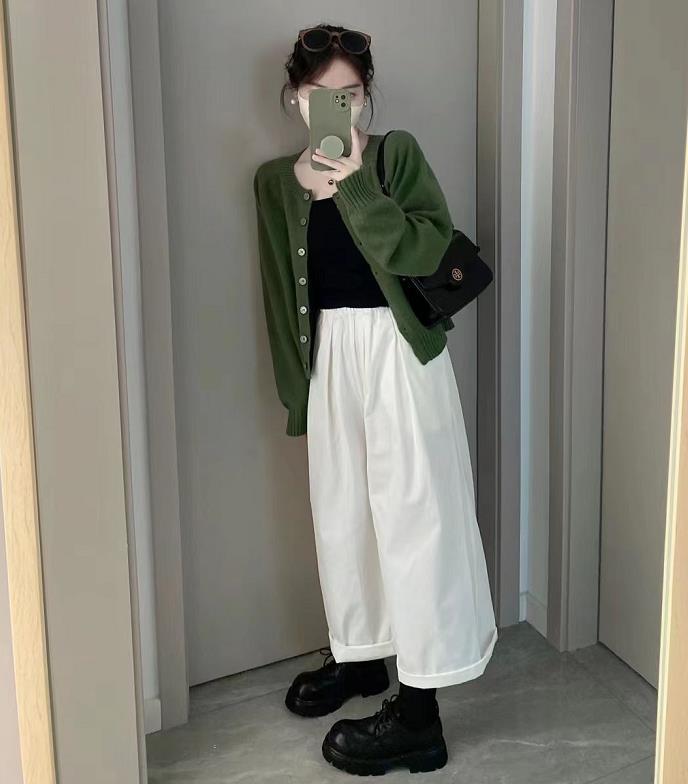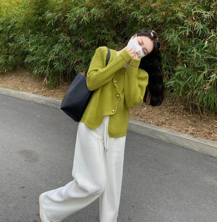 很適合小個子女生的穿搭,綠白配真的好好看啊,綠色針織衫上衣,上面釦子的設計就很特別,下襬也是不規則的。搭配一條白色拖地褲,整個配色簡直不要太好看了。