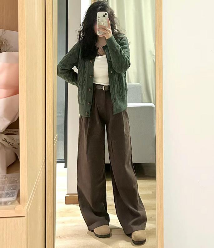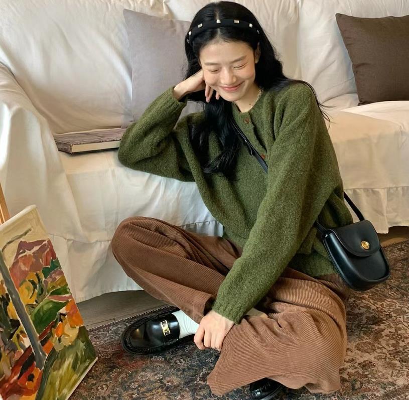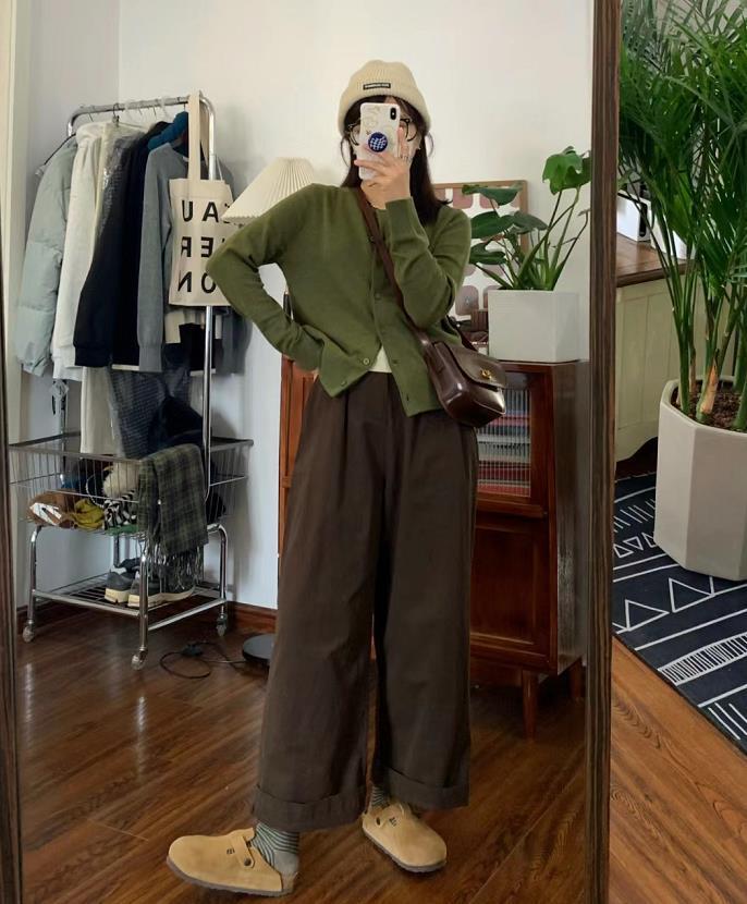 好喜歡這套棕綠的穿搭,綠色毛衣開衫,質感非常好,上面的扣子設計也很精緻,搭配咖色西裝長褲,帶點隨性又不失學院風的感覺。