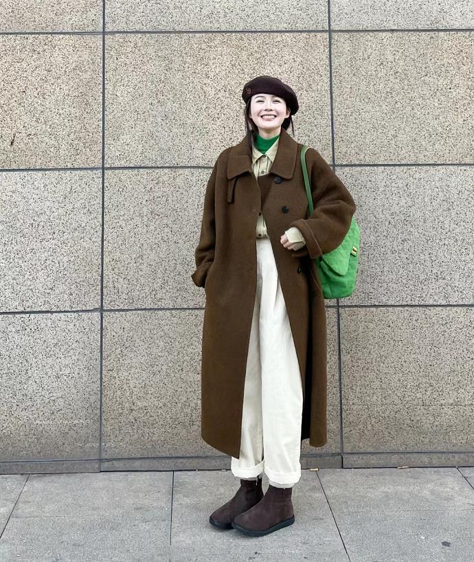 棕色大衣外套,穿起來也太保暖了,寬鬆的版型襯托下,身上的缺點都被隱藏起來了,內搭進行了疊穿,爲整個着裝增添了細節。