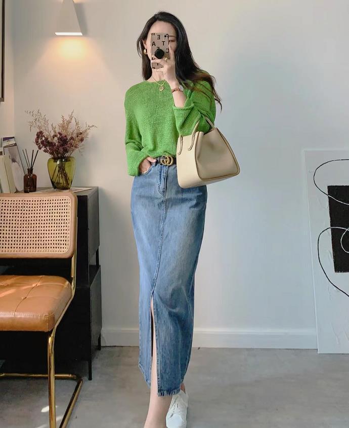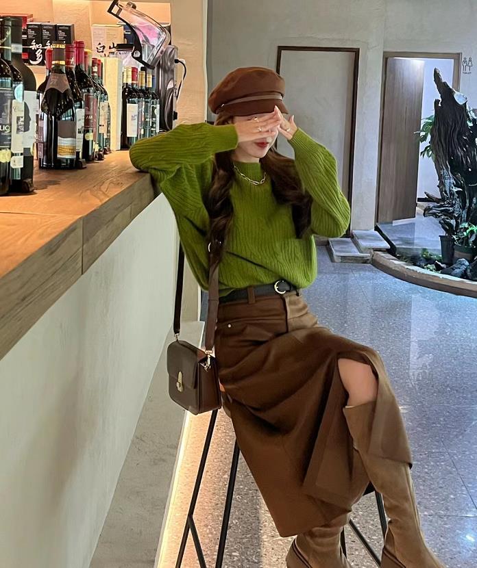 綠棕的配色就是太顯復古感了,基礎款綠色毛衣,很百搭又不挑人,選擇棕色開叉半身長裙,腿部的線條瞬間就被拉長了。記得要佩戴一些項鍊進行點綴,這樣才更顯精緻。
