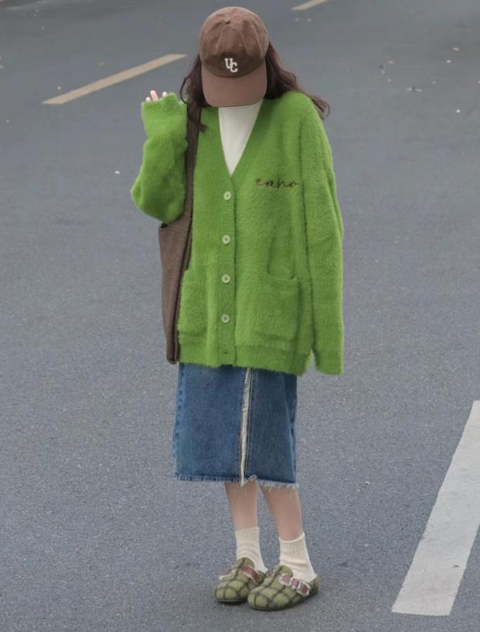 綠色系的毛衣開衫,穿起來可顯瘦藏肉了,也能讓你展現出慵懶隨性的味道,乍暖還寒的早春穿這麼一件開衫正合適。配牛仔半裙,真的很好看啊。