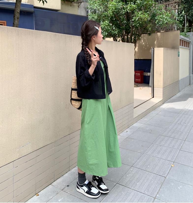 誰懂,早春穿上這麼一條綠裙子太好看了,黑配綠的顏色組合很吸睛,天氣熱一點, 把外套一脫就行。腳下踩着一雙黑色運動鞋,休閒舒適又好看。