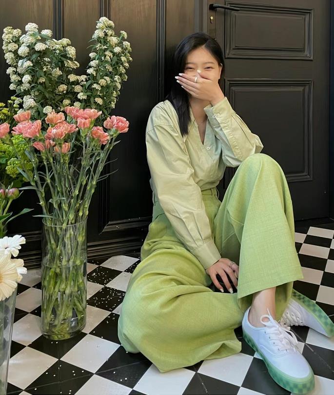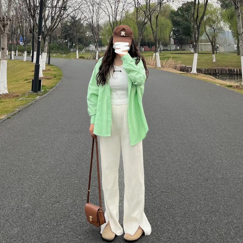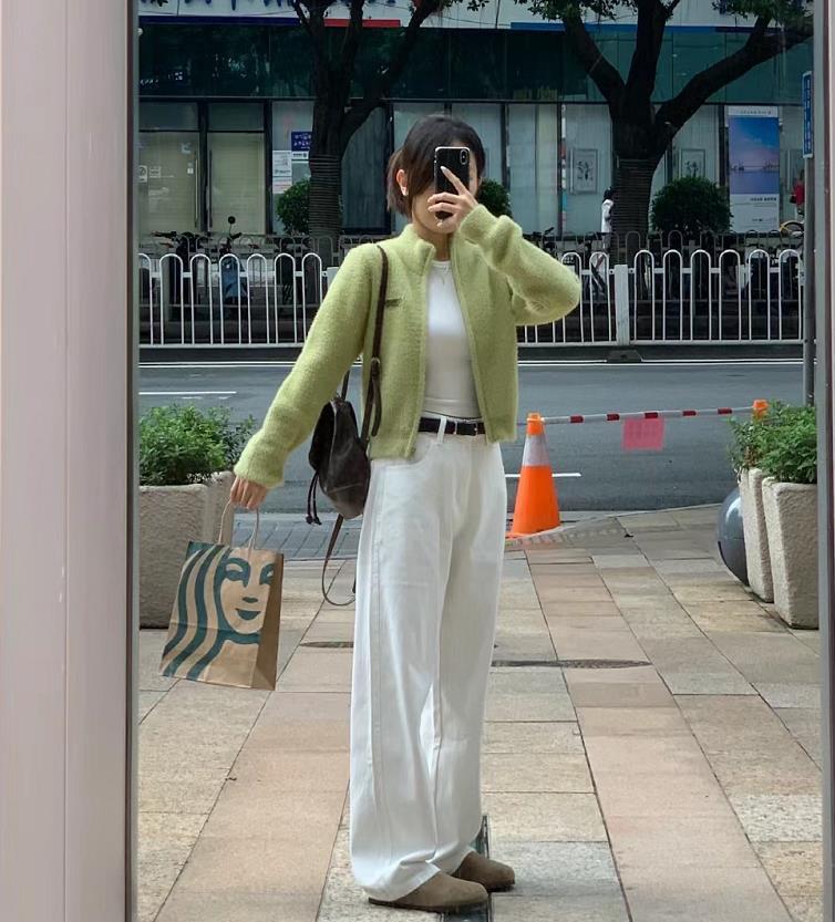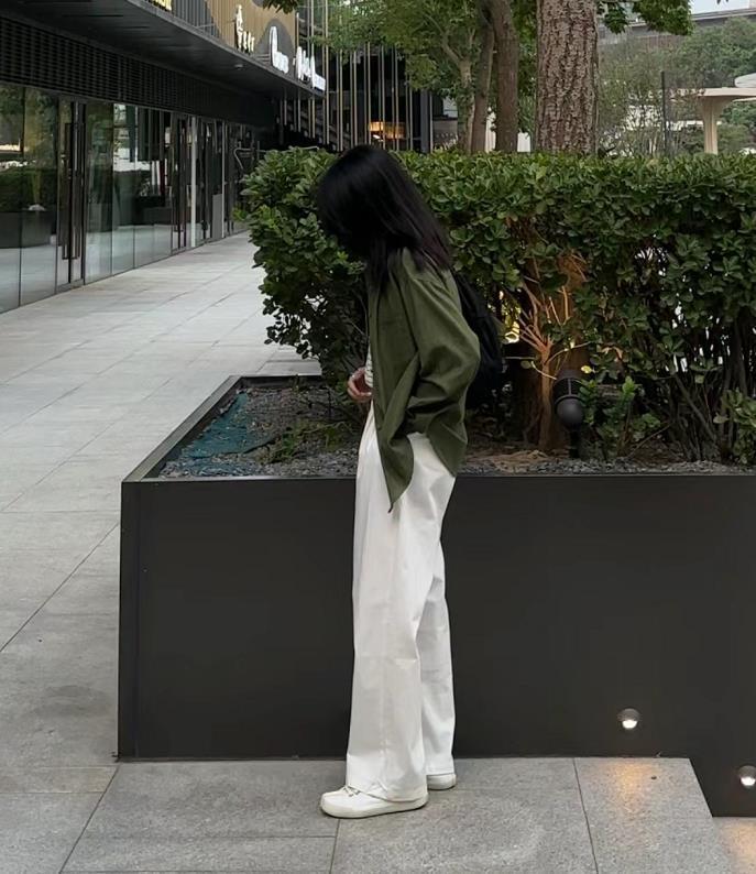 大白色直筒長褲,穿得顯瘦的同時又顯腿長,綠色+白色的配色,太搭了。
