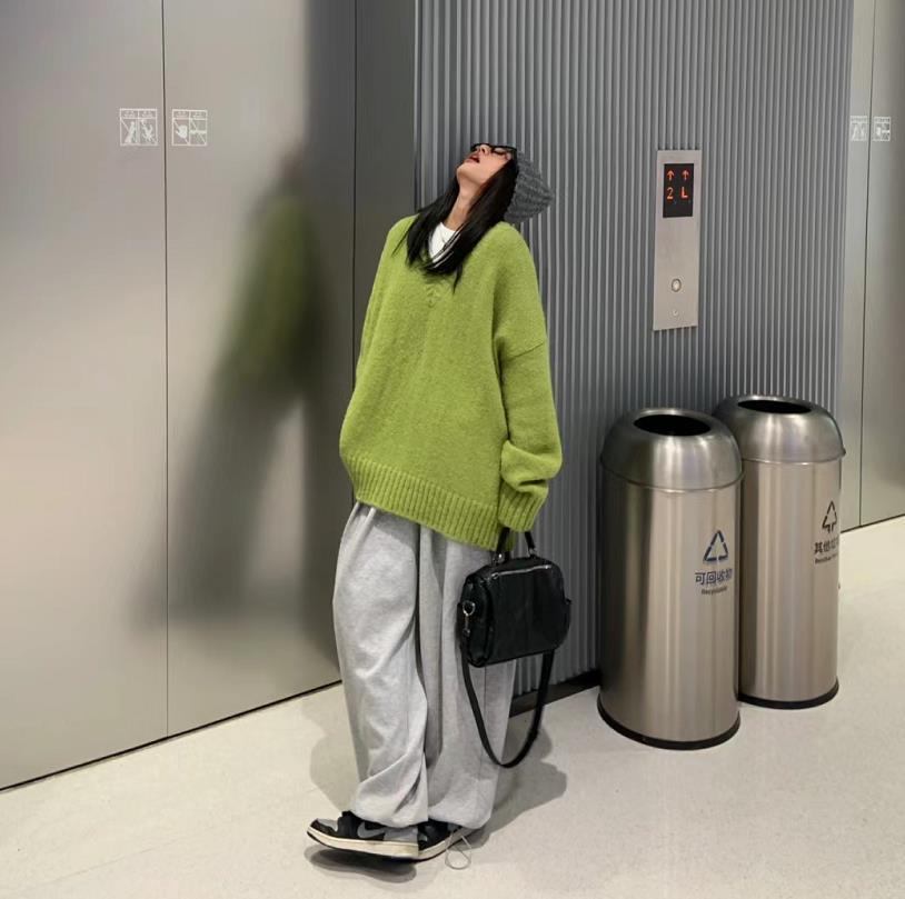 綠色毛衣也太顯白了吧,搭配黑色長褲,雙倍顯白的穿搭,喜歡這種低調的綠,飽和度並不高,黃黑皮都能駕馭。
