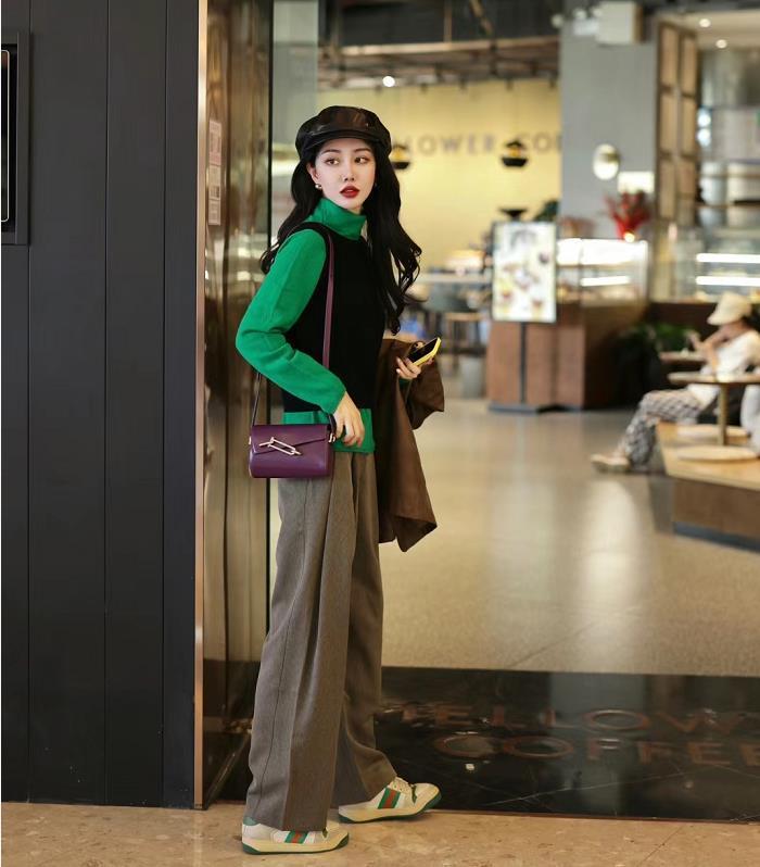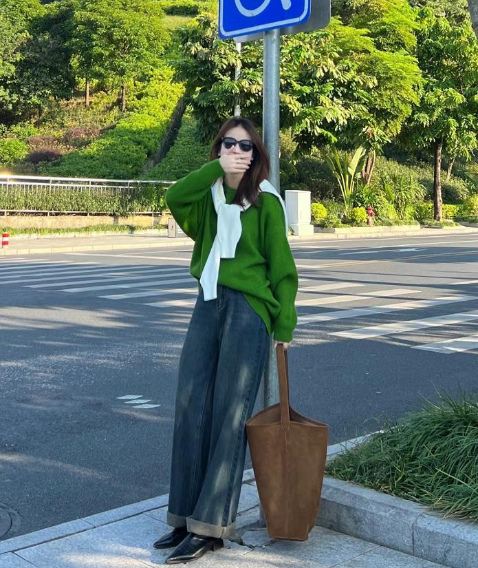 復古又慵懶的苔蘚綠毛衣,這個綠色是真的很喜歡啊,搭配棕色的長褲,還蠻好看的。黑色包包和鞋子混搭,又多了幾分沉穩。