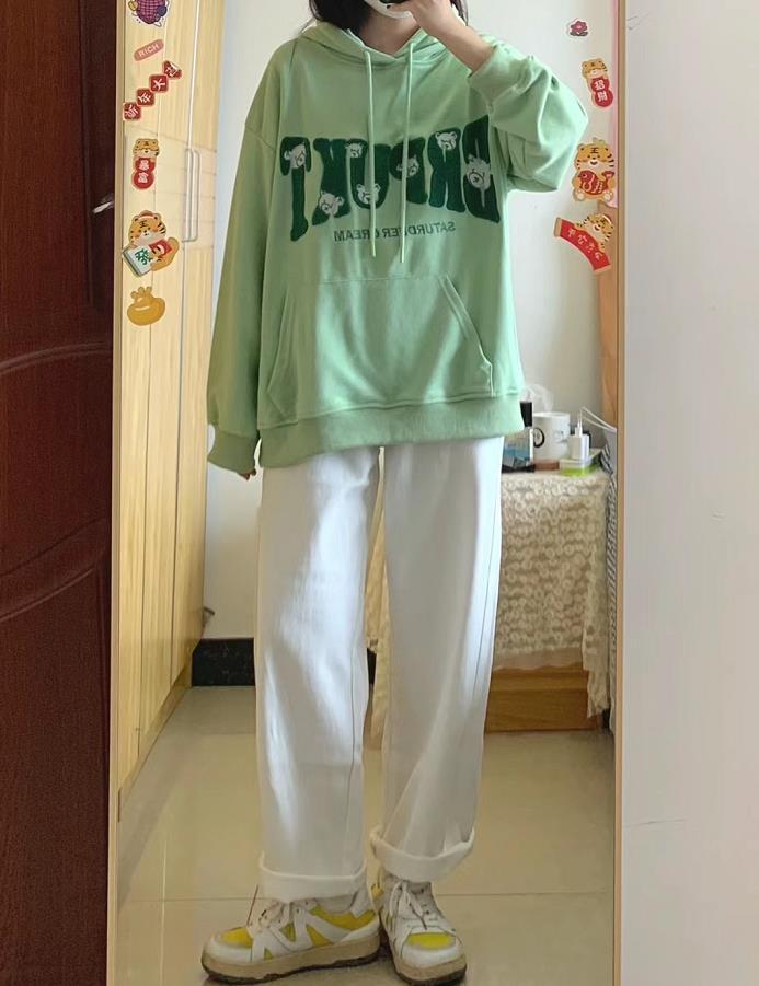 寬鬆的綠色衛衣+白色褲子,這忽然覺得綠+白的配色好好看啊,整體就是給人乾乾淨淨,讓人眼前一亮的感覺,好喜歡。
