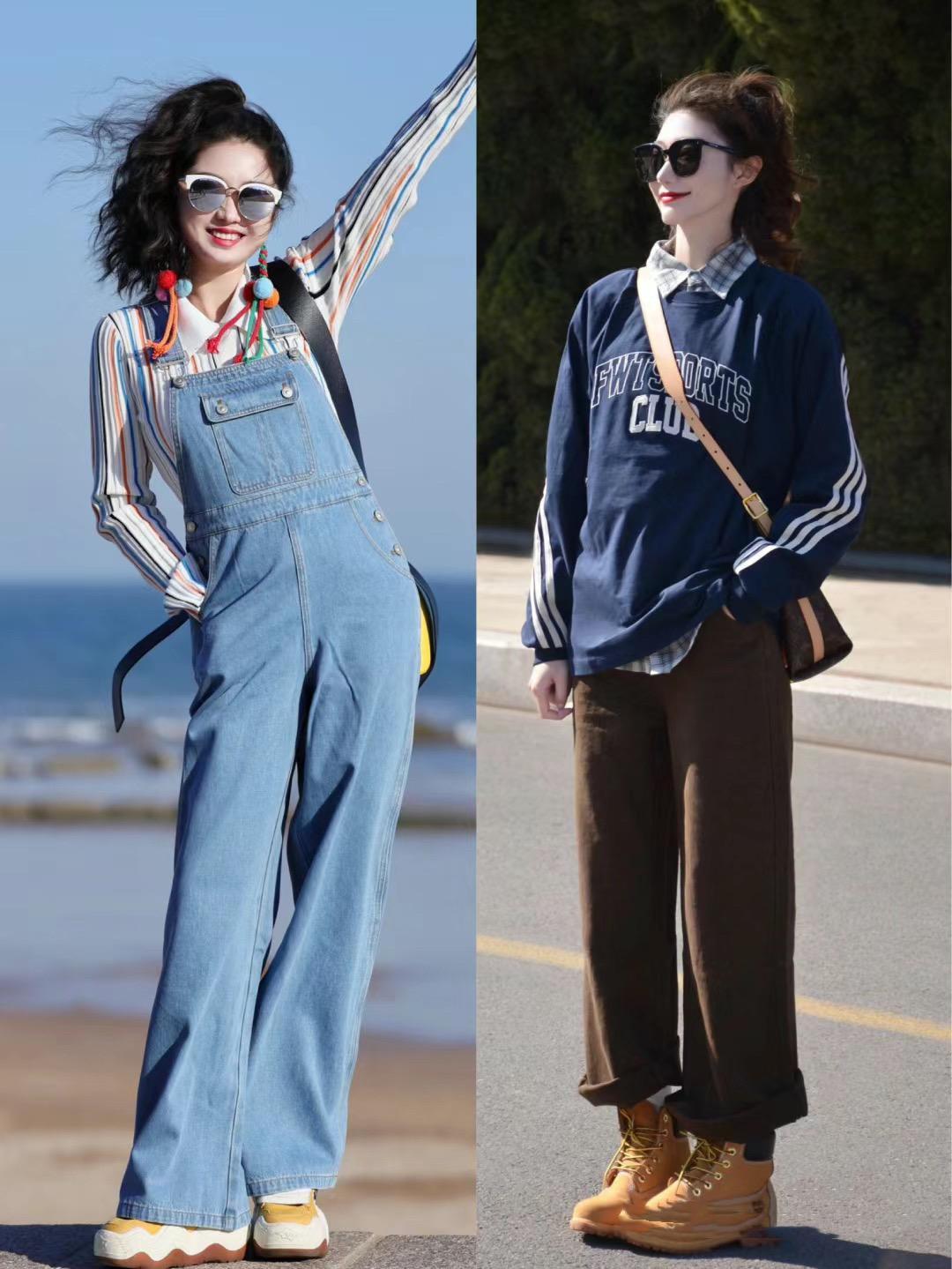 牛仔揹帶褲屬於比較寬鬆的褲型,這種減齡又活潑的牛仔揹帶褲搭配了厚底的運動鞋,更加大方顯高。早春季節,淺色系的厚底運動鞋,或者撞色運動鞋都很洋氣。