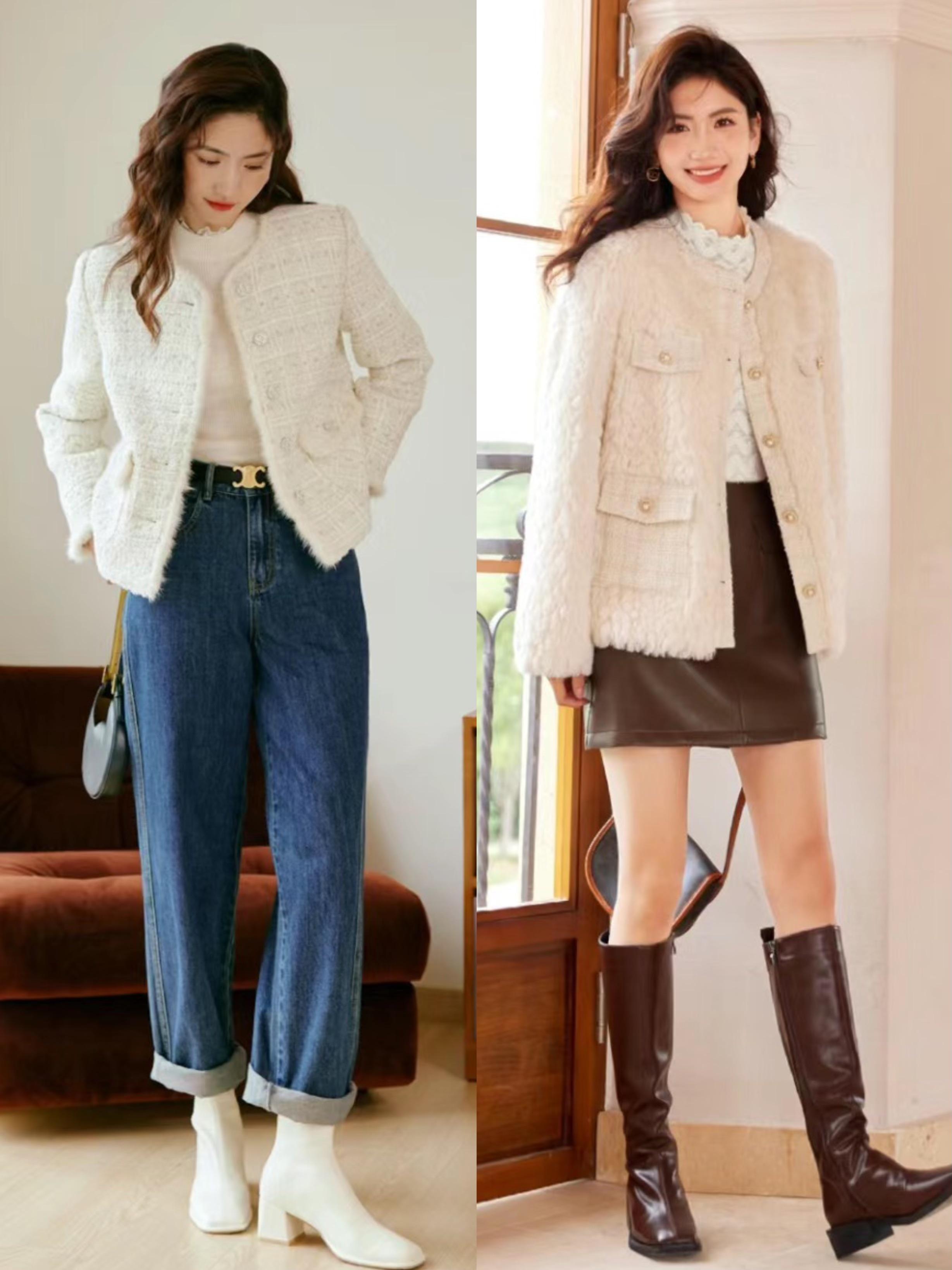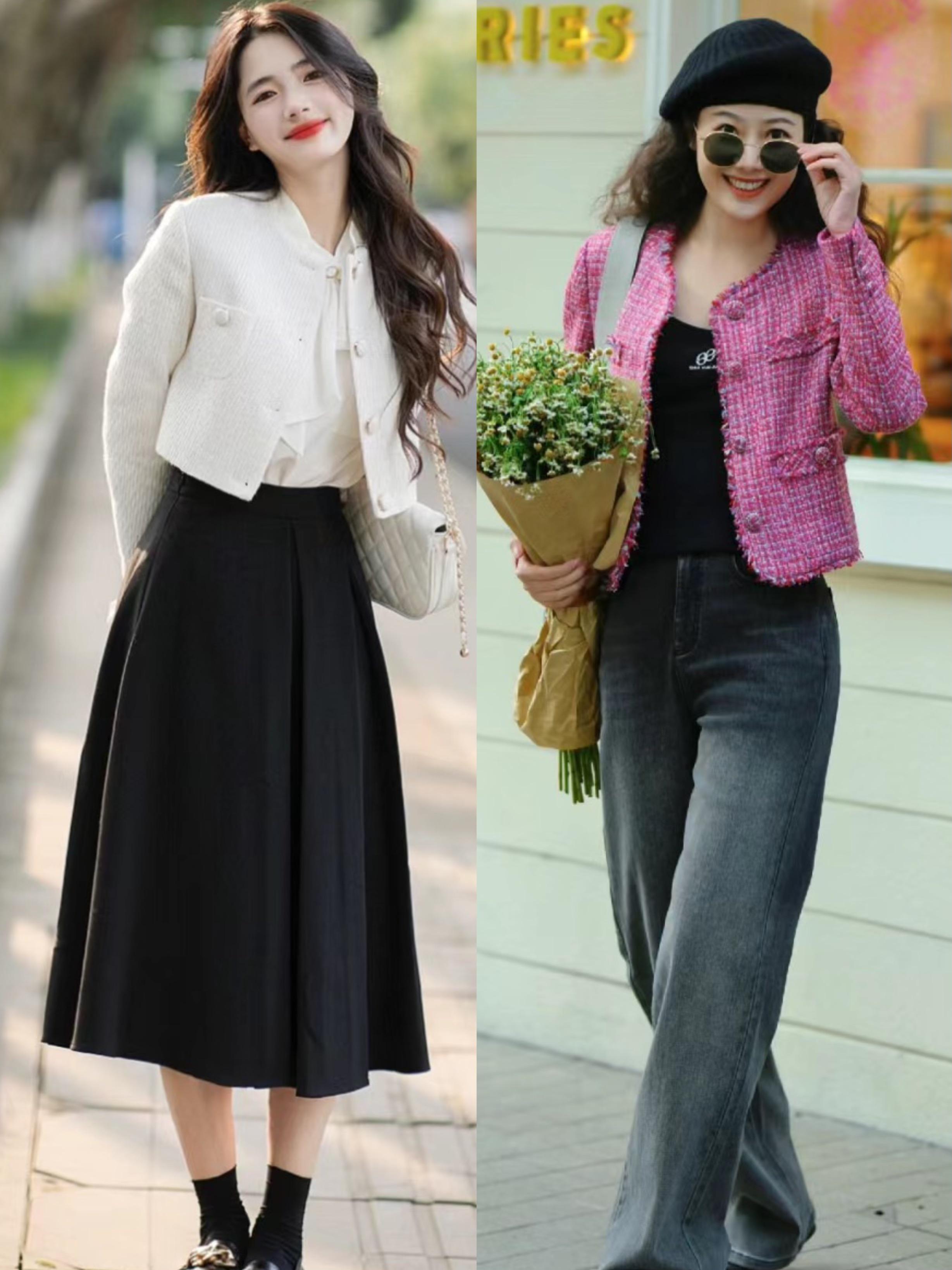 但如果你的腰腹部線條沒有那麼纖薄,我們可以選擇一種更溫和、體面的穿着方式。比如過腰遮胯的小香風外套,就更加適合梨型身材。配高腰褲/裙,利落又大方。