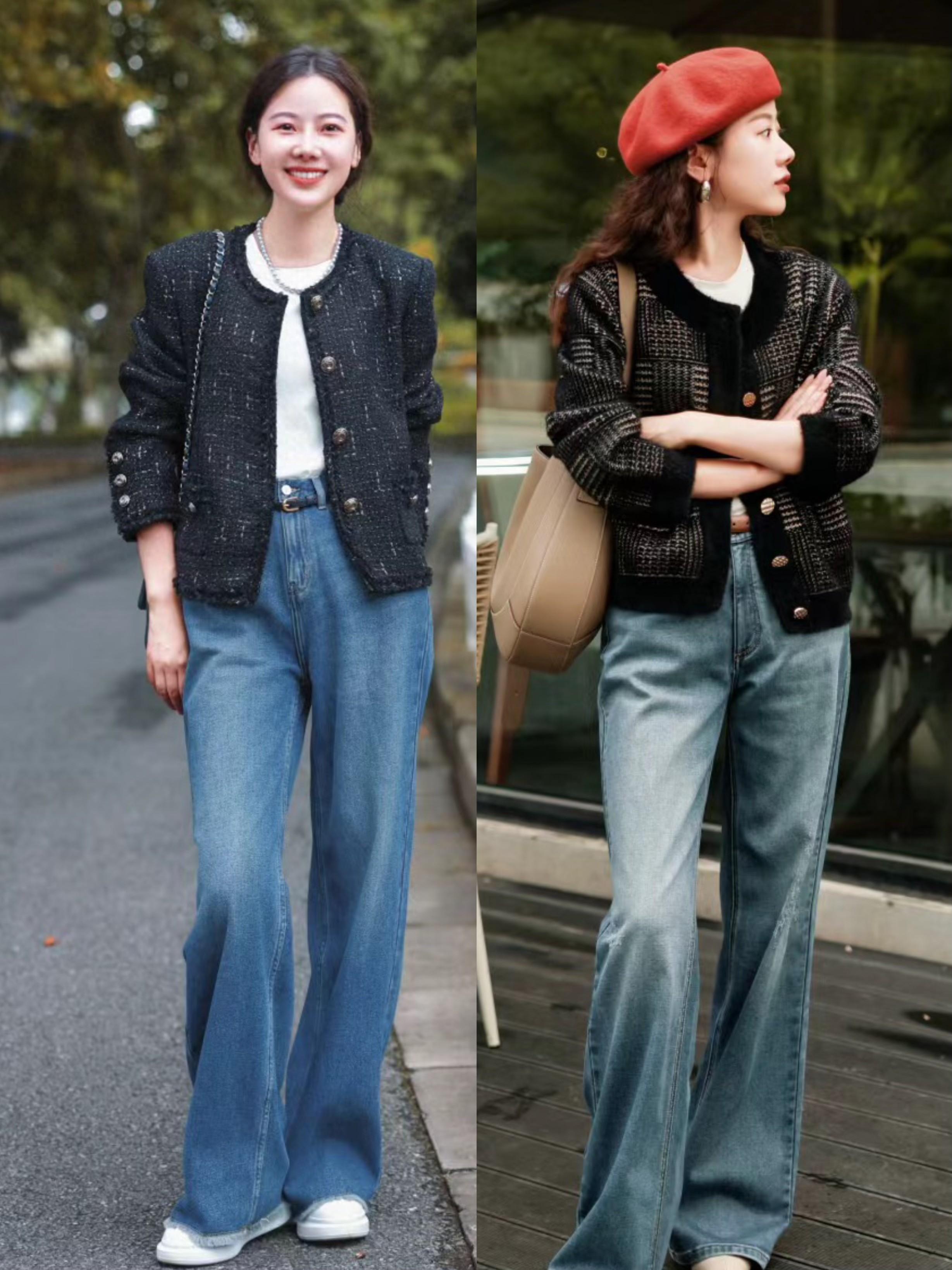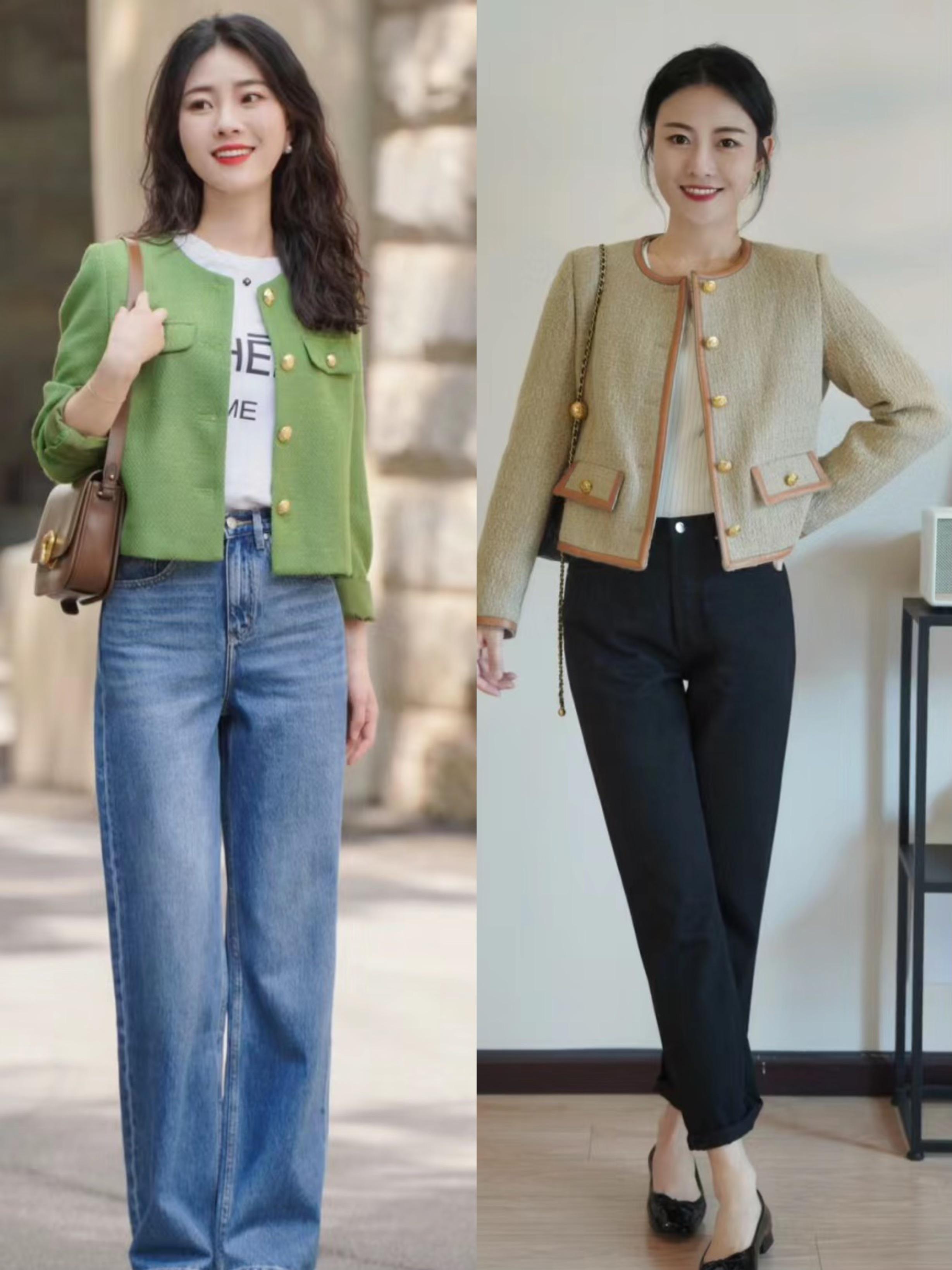 小香風外套+高腰的直筒牛仔褲