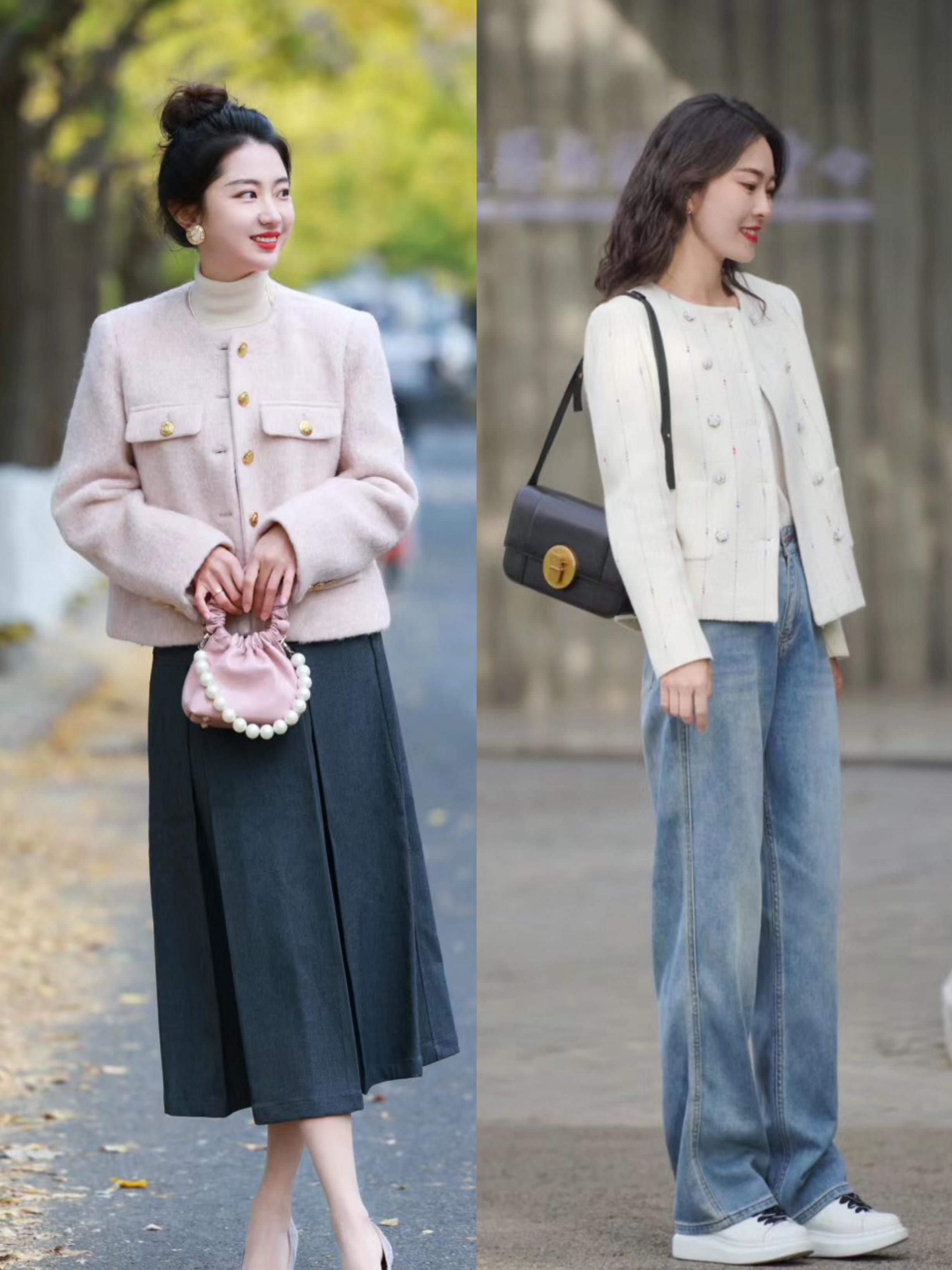 想要一種高級時尚的美,我們可以選擇設計感比較精緻的小香風外套。比如常規的小香風版型,立體的墊肩、精緻的紐扣、五金,都可以增加高級氣場。