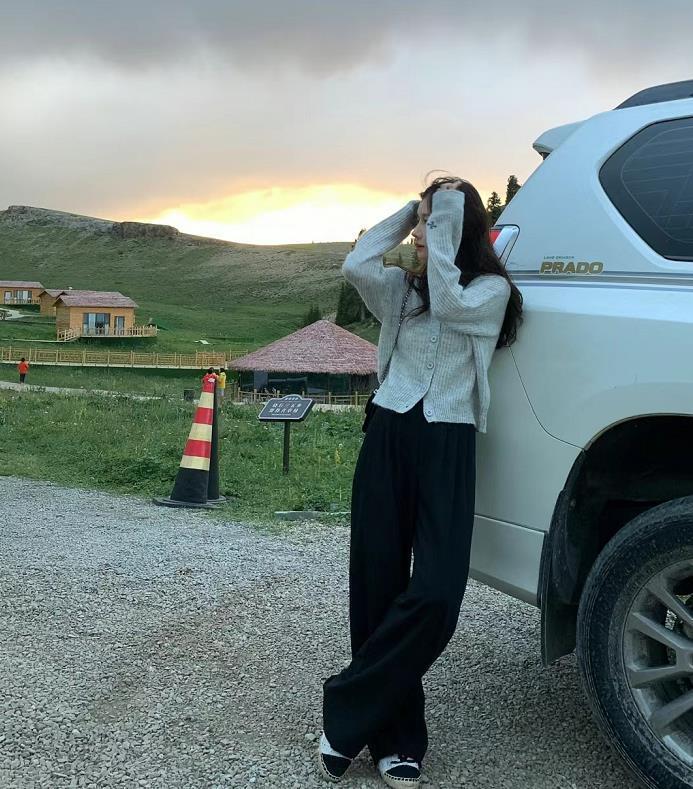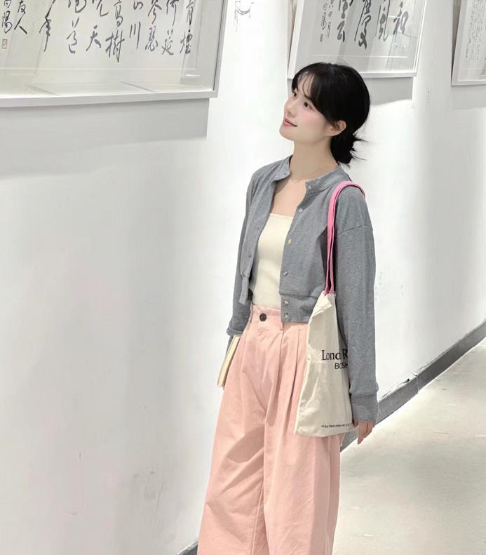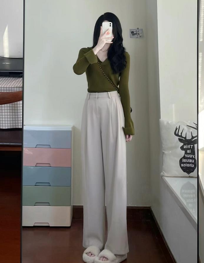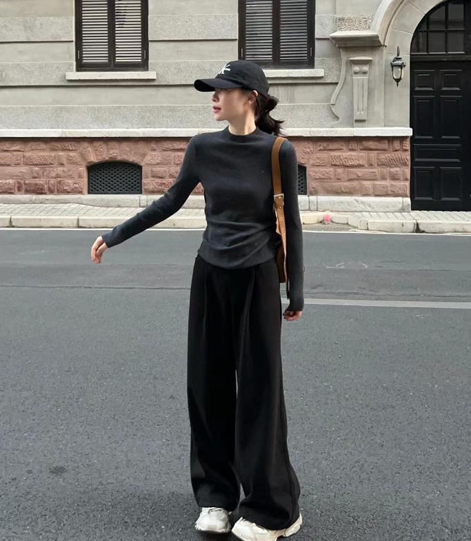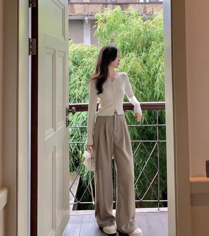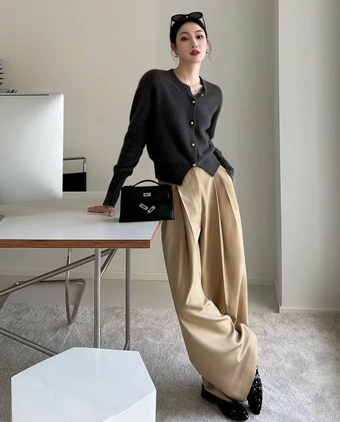 上短下長的穿搭輕鬆就能優化整個身材比例,就算是150的個子也可以輕鬆穿搭高挑感。小金扣設計的黑色針織開衫,細節感十足,搭配闊腿西裝拖地褲,就很有氛圍感了。