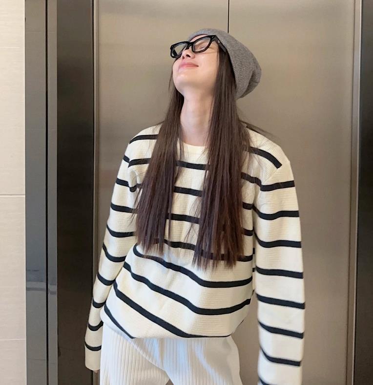 條紋毛衣就是我的最愛,灰色針織帽配黑框眼鏡,就算是素顏也不用擔心,下身搭配針織闊腿褲,將最舒適的狀態呈現出來。