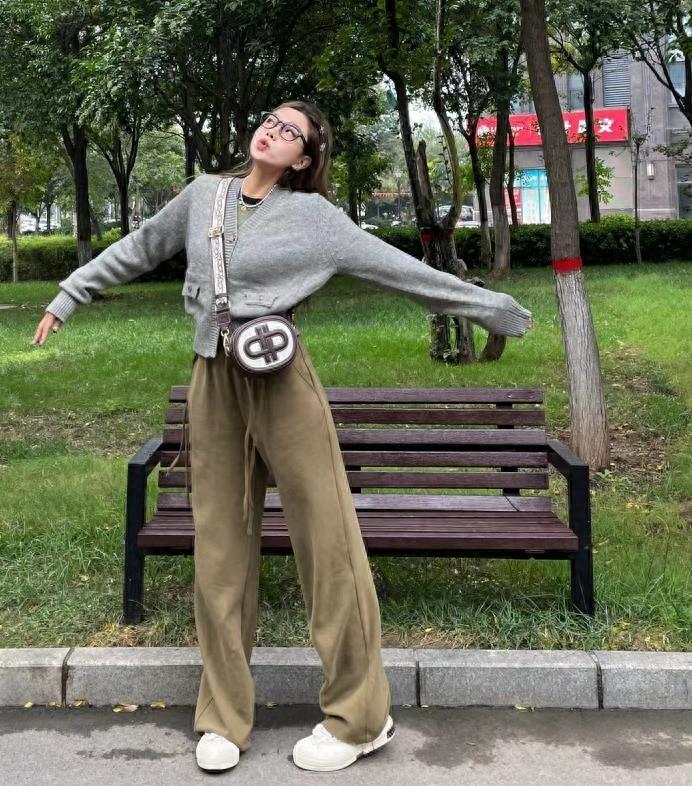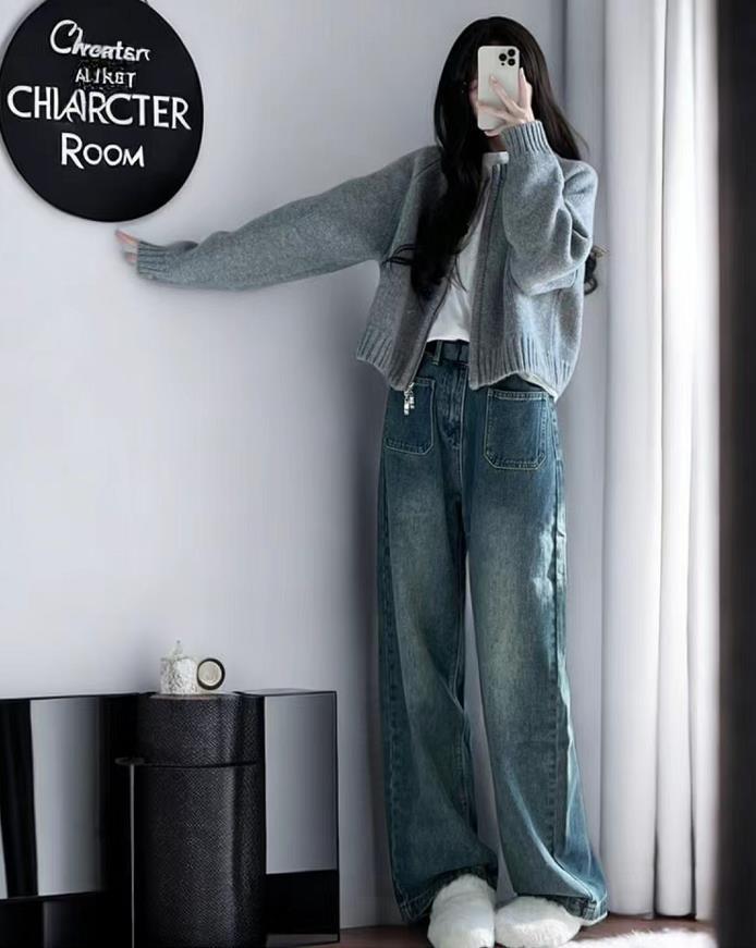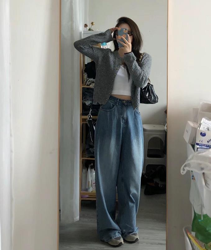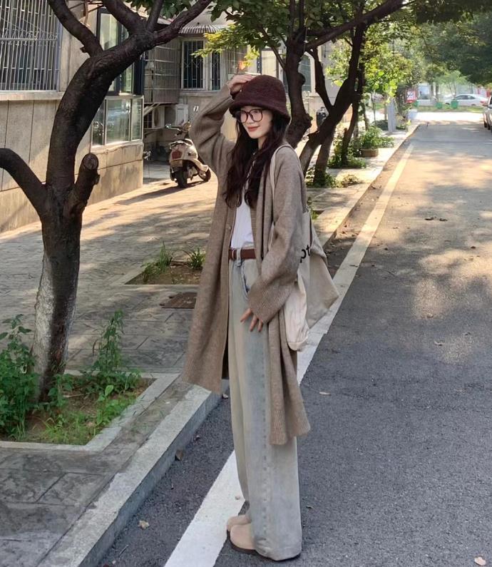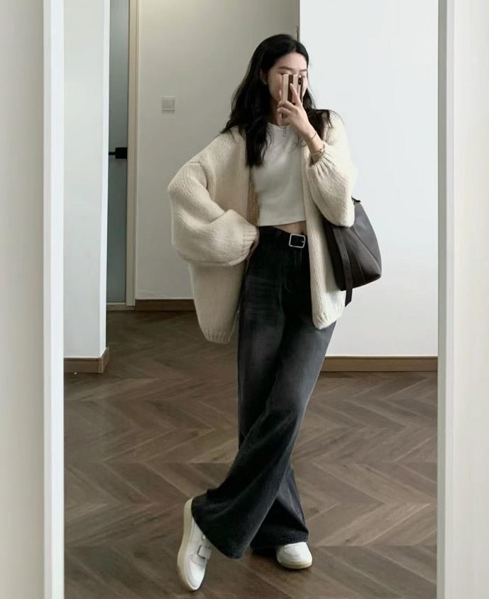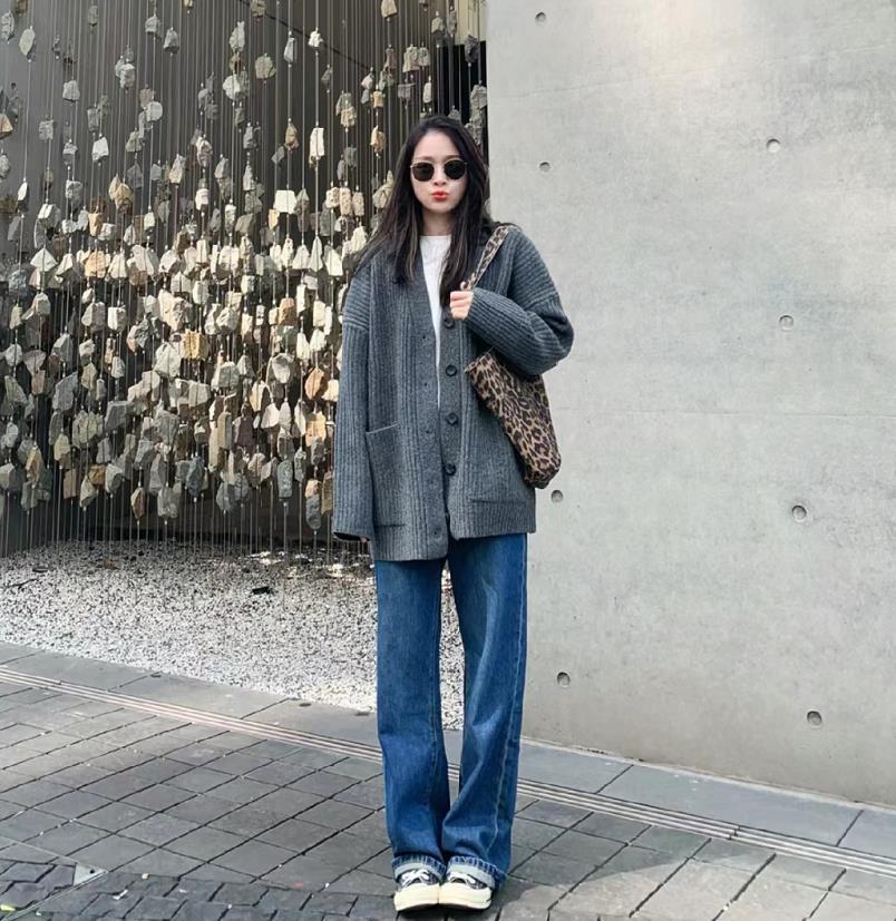 慵懶風十足的穿搭,灰色系毛衣針織開衫,大大的版型,不僅藏肉顯瘦,還帶着幾分慵懶的味道。與直筒牛仔拖地褲結合,遮肉顯瘦顯腿長。