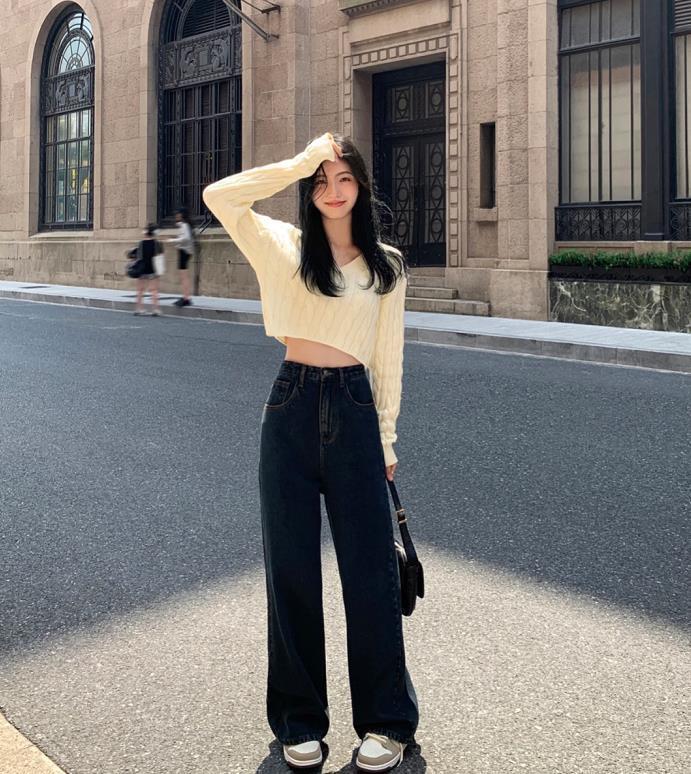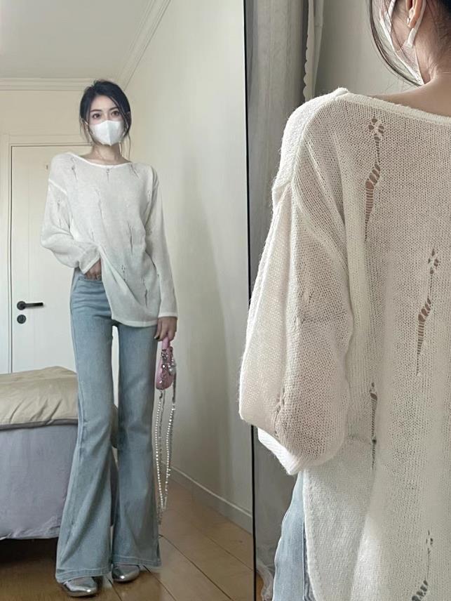 這套太乾淨了,簡簡單單的溫柔感,白色寬鬆針織衫,有些薄透感,建議在裏面疊穿一件背心,微喇牛仔長褲的加入,不僅讓你襯托得很氣質,還顯瘦。