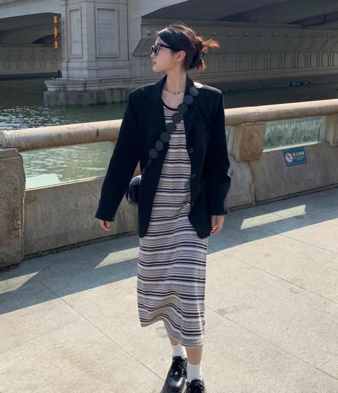 條紋針織裙+黑色西裝外套,內繁外簡的組合,實在是太顯層次了,也非常時髦,寬度適中的版型,很好隱藏起身上的贅肉,顯瘦效果真的超讚。