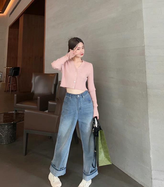 太適合早春的穿搭了,短款v領針織衫搭配直筒牛仔褲,上短下長的組合,輕鬆就優化了整個身材比例。杏色的針織衫,給人的感覺就十分溫柔氣質,加上運動鞋後就很休閒了。