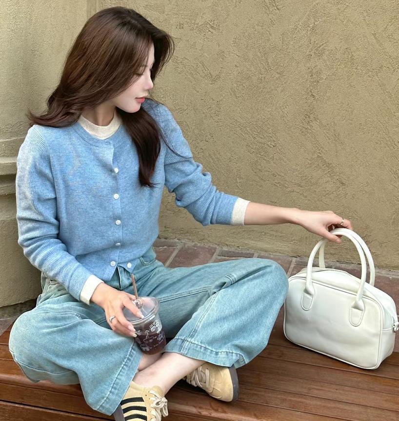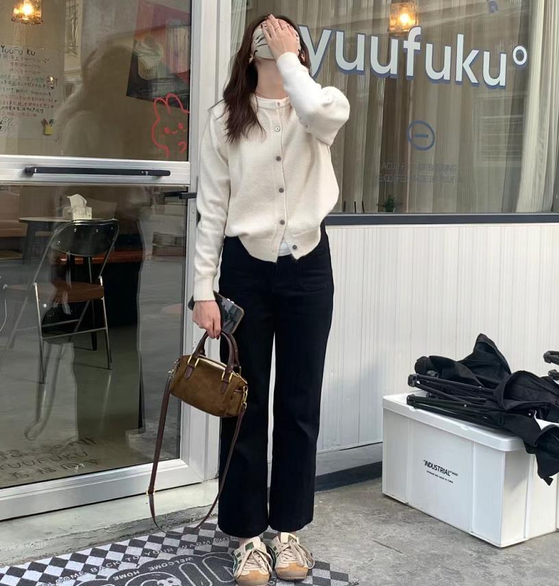 很顯慵懶的韓系穿搭look,小個子女生也能輕鬆駕馭,奶白色的針織開衫,穿起來也太溫柔了,最重要的是非常百搭。