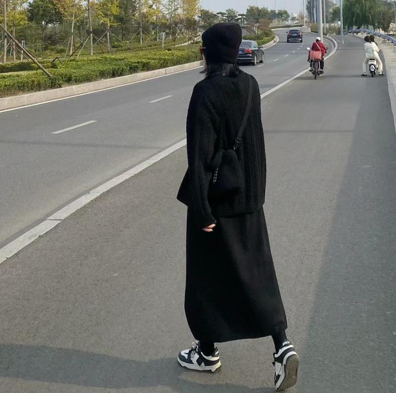 一身黑色系的穿搭,真的自帶沉穩感,黑色針織衫+半身裙,上下顏色一致的配色組合,不僅和諧還非常高級。
