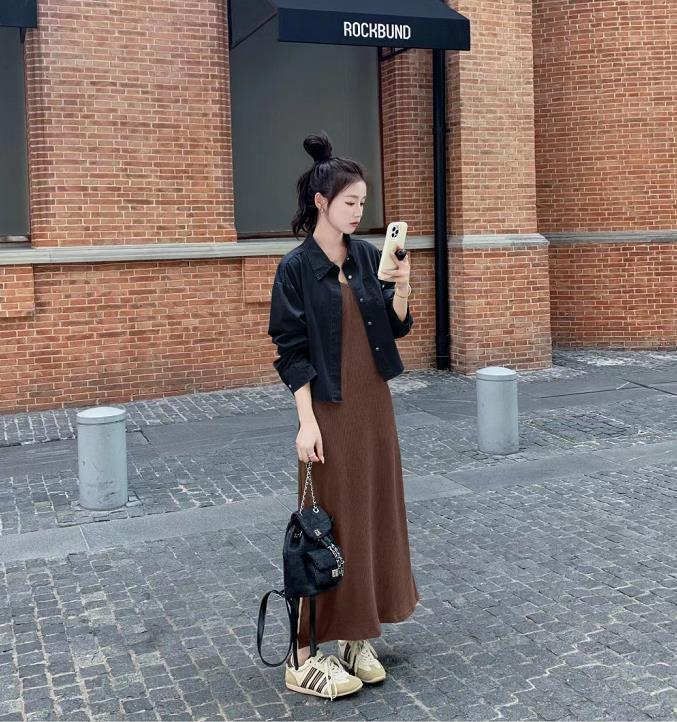 牛仔襯衫+針織裙,韓系風十足的打扮,應對早春和初秋都合適哦,運用了上短下長的搭配組合,很好對身材進行了修飾和優化。