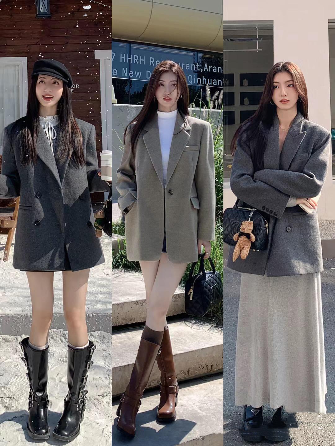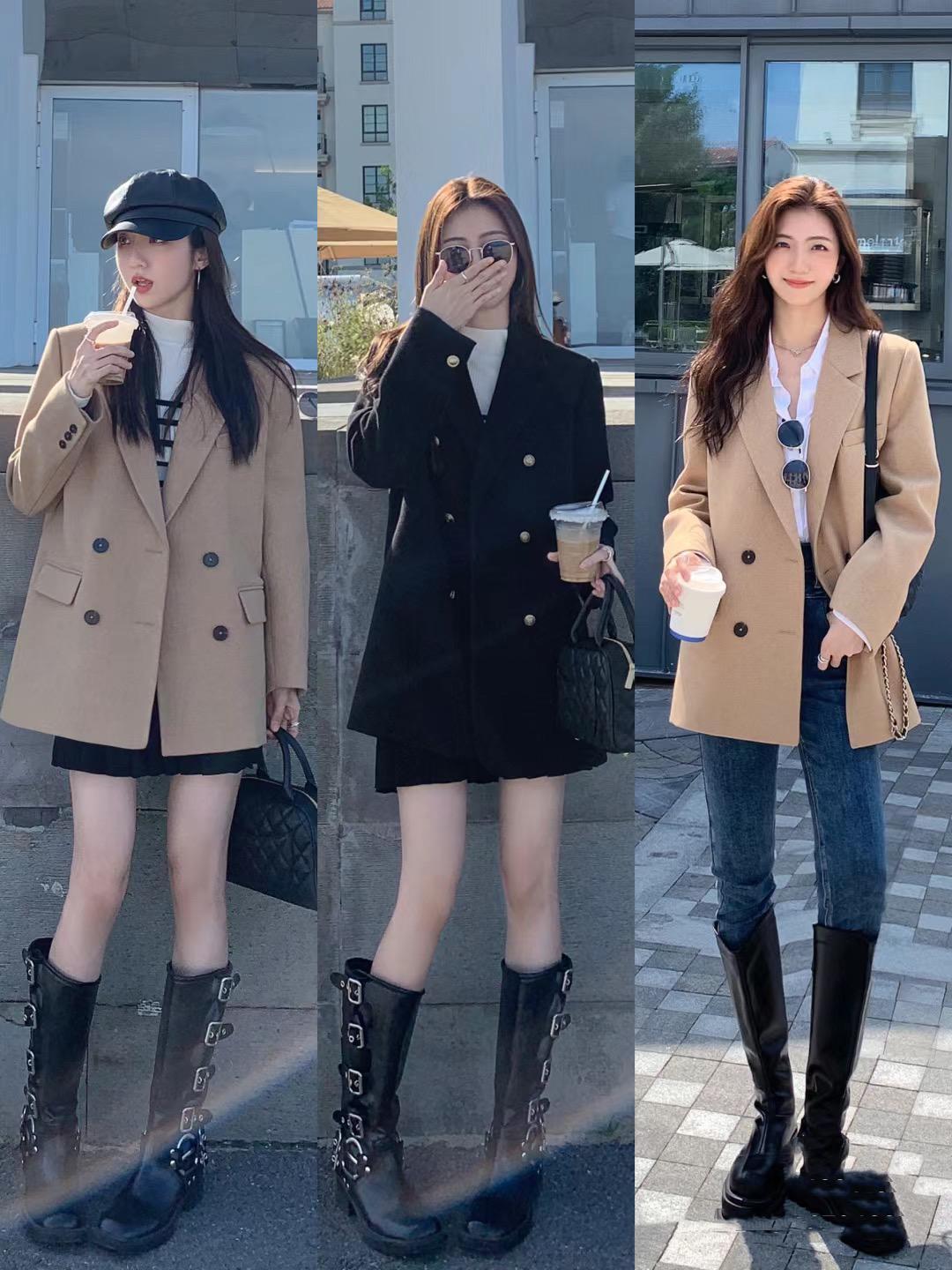 稍微寬鬆的西服外套,墊肩的設計氣場十足。我們可以用西服外套來搭配到膝蓋附近的長筒靴,厚底的長筒靴更加帥酷瀟灑,搭配西服外套顯得時髦又摩登。
