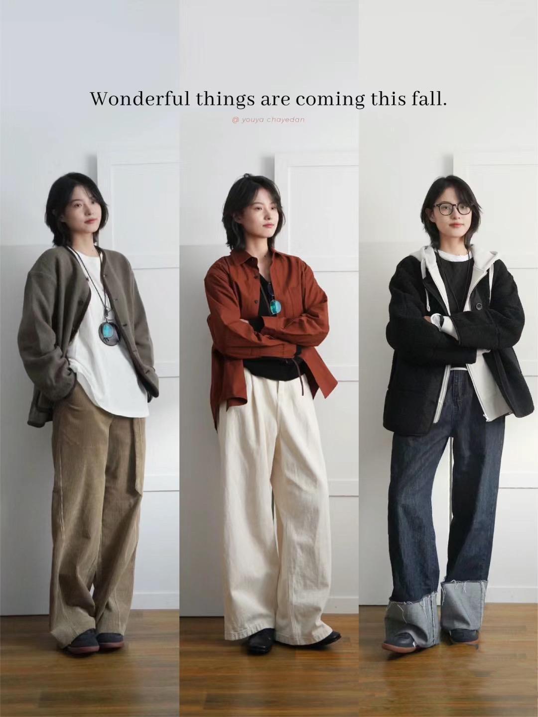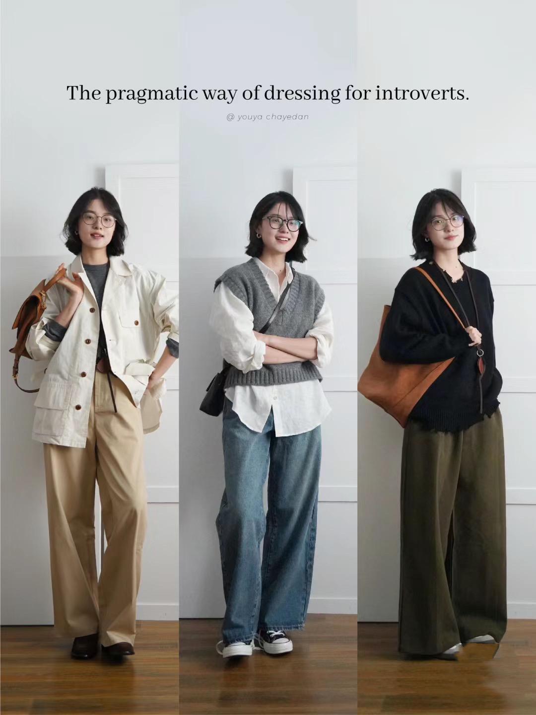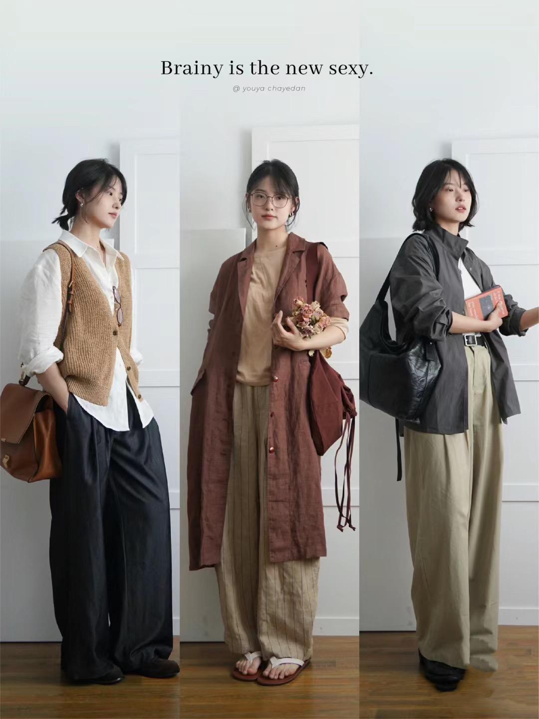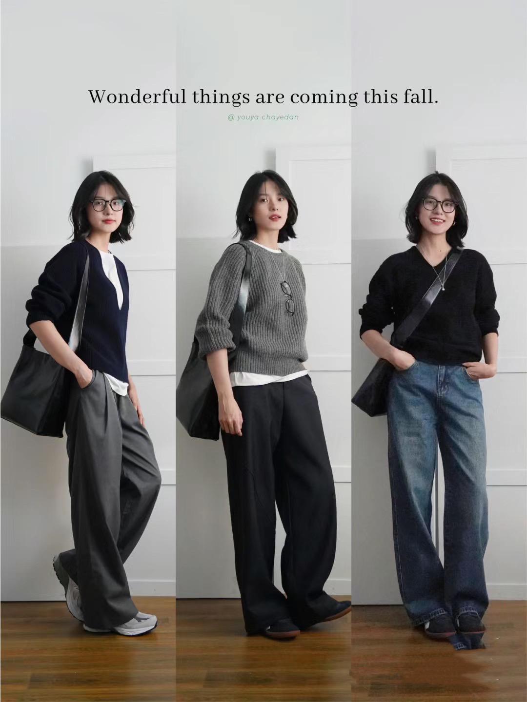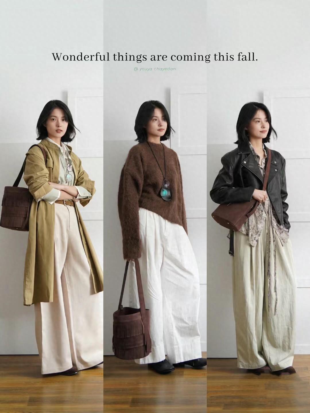 塑造膠囊衣櫥的話,我們可以多選擇基礎經典的服裝。越是基礎經典的服裝,越是可以更加自由的搭配。比如闊腿褲,不僅可以搭配針織衫,還可以搭配襯衫、馬甲、牛仔外套等等。