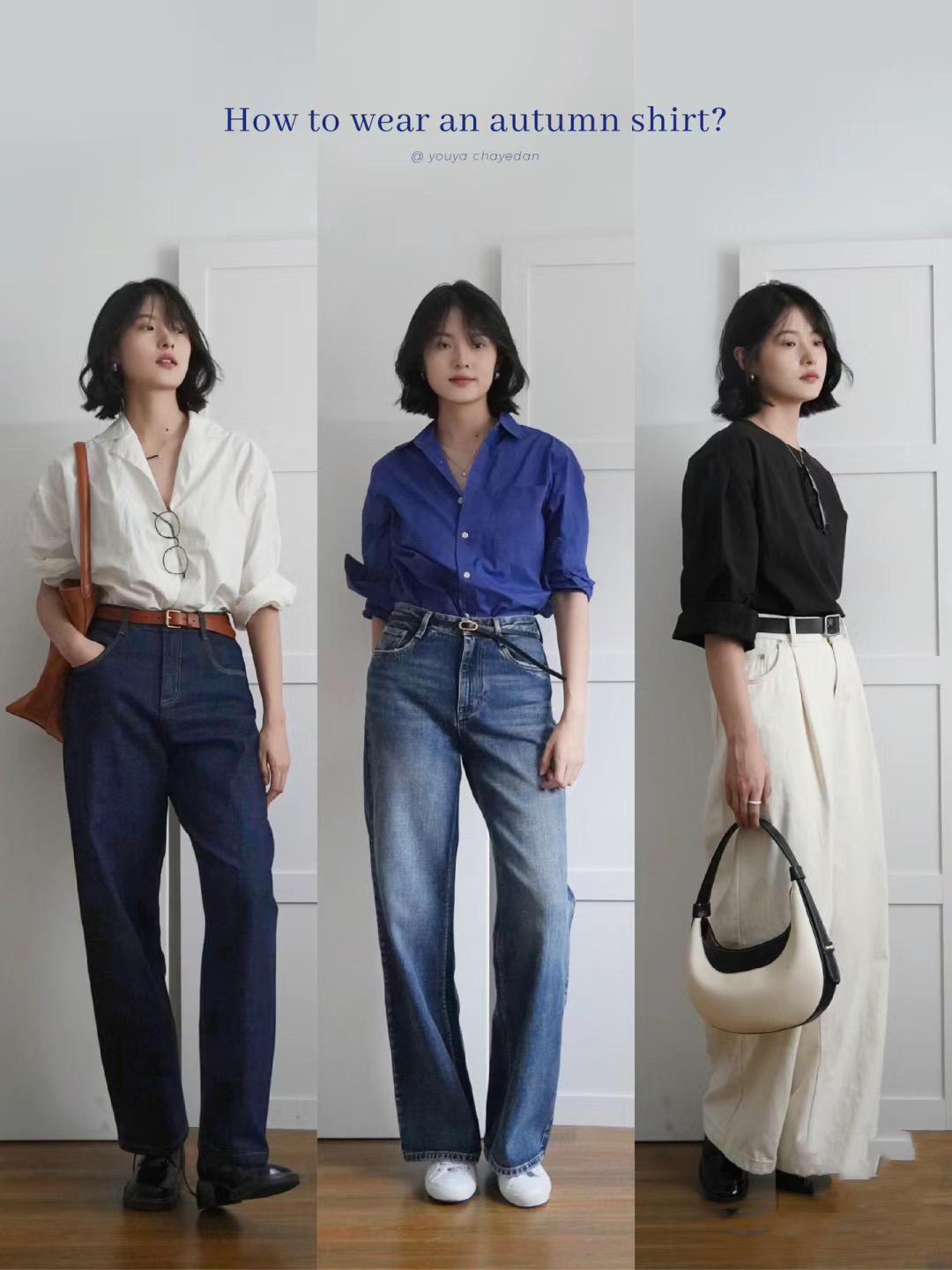 不管是挺闊的白色襯衫,還是高級感十足的藍色襯衫,都可以搭配高腰的牛仔褲來穿着。像這種挺闊襯衫+高腰直筒牛仔褲的搭配,也是塑造極簡衣櫥的關鍵。