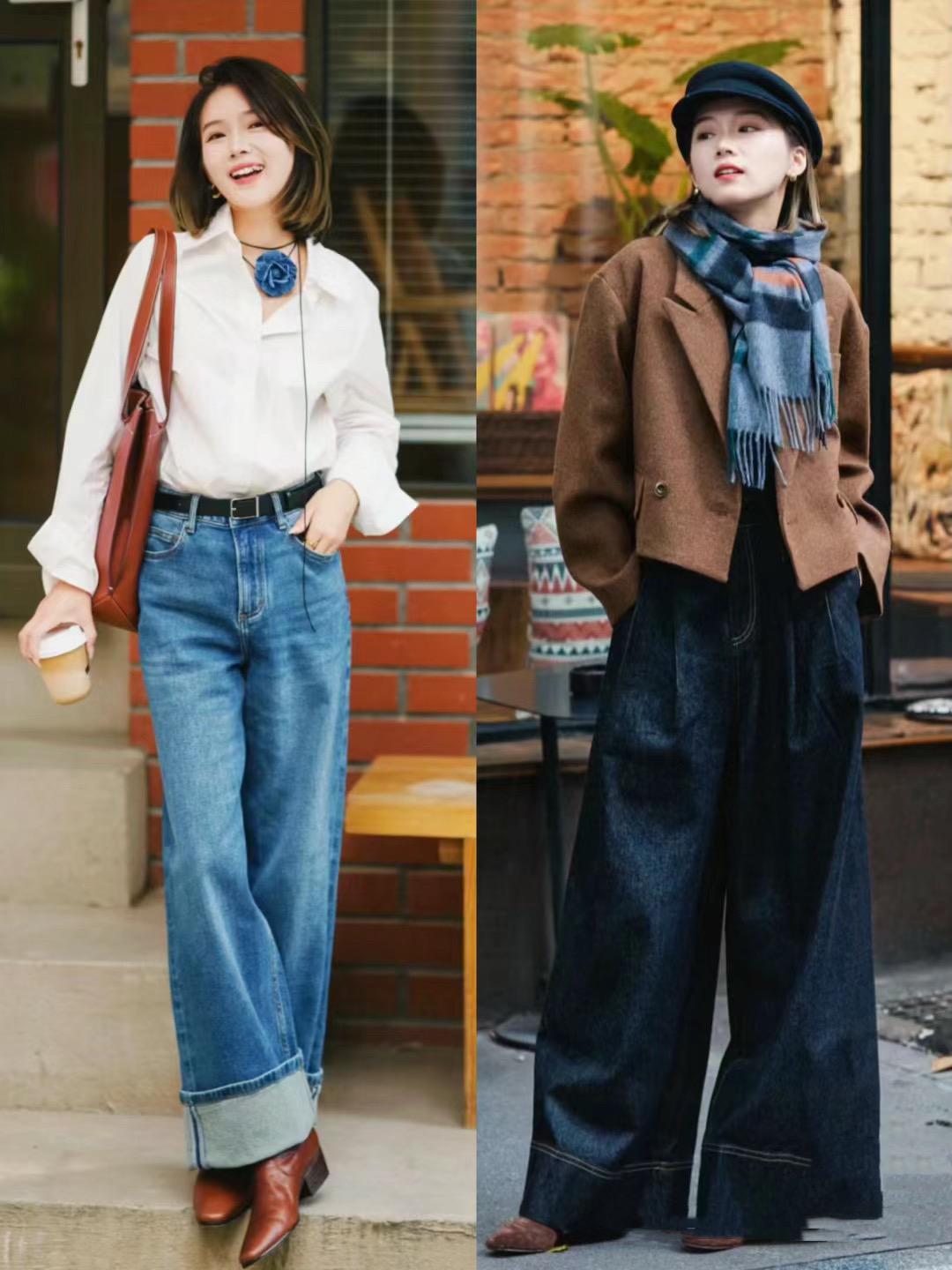 我們穿着高腰的牛仔闊腿褲,可以搭配短款的上衣。比如短款的針織衫、襯衫,配高腰的牛仔闊腿褲,就可以塑造出細腰長腿的既視感。