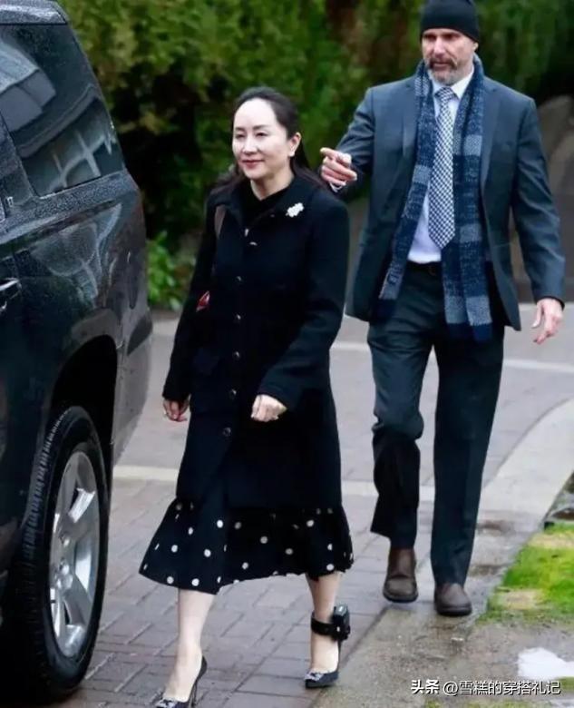 孟晚舟常穿一條黑色的裙子,上面要麼帶有波點圖案,要麼帶有簡約的蕾絲花邊,這種帶簡單小設計的單品,可以使得裙子更加時尚洋氣一些,同時有了基礎的黑色作爲過渡,怎麼穿都不會顯得太花裏胡哨。