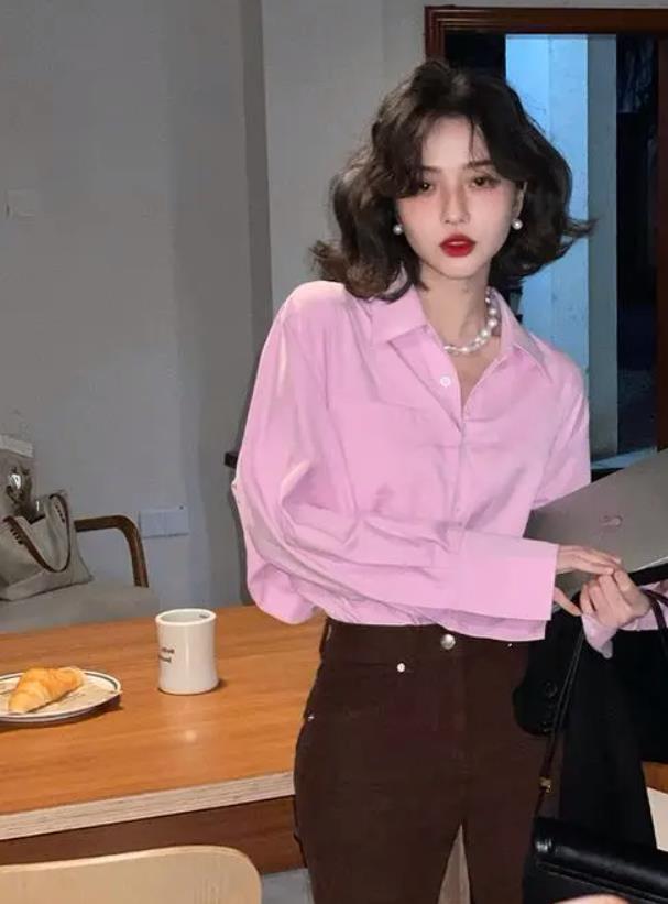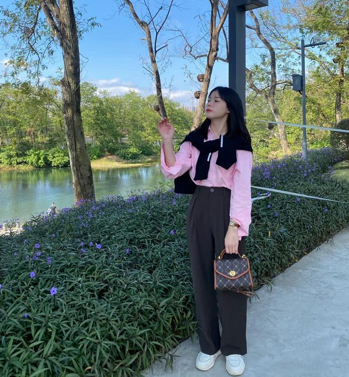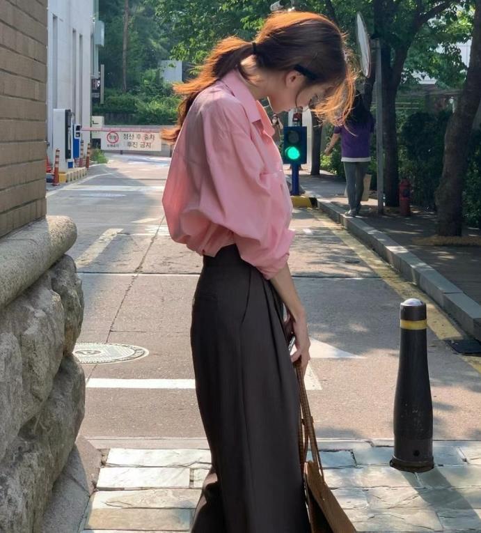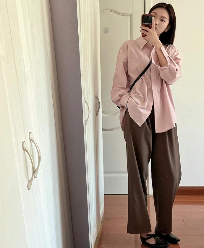 粉襯衫+咖色西裝褲真的絕了,淺淺淡淡的粉色,很襯膚色和顯白,基礎款還是很好穿的,寬鬆的版型更是不挑身材。