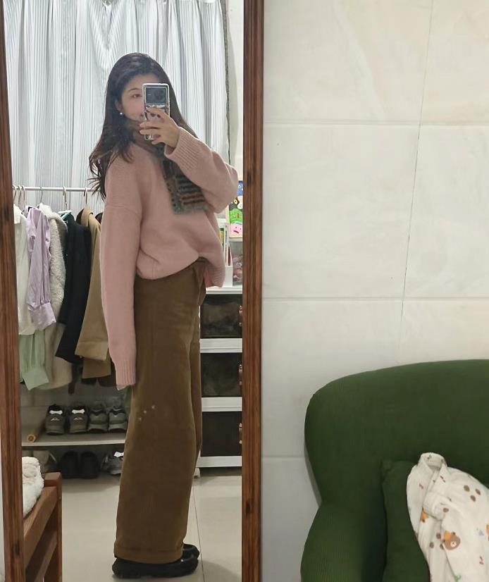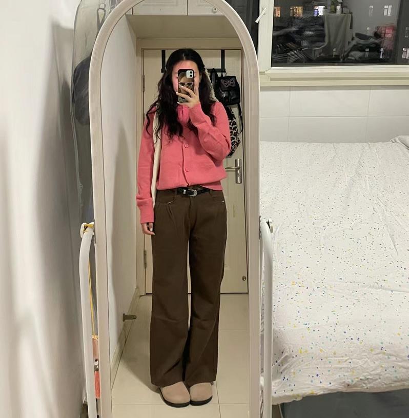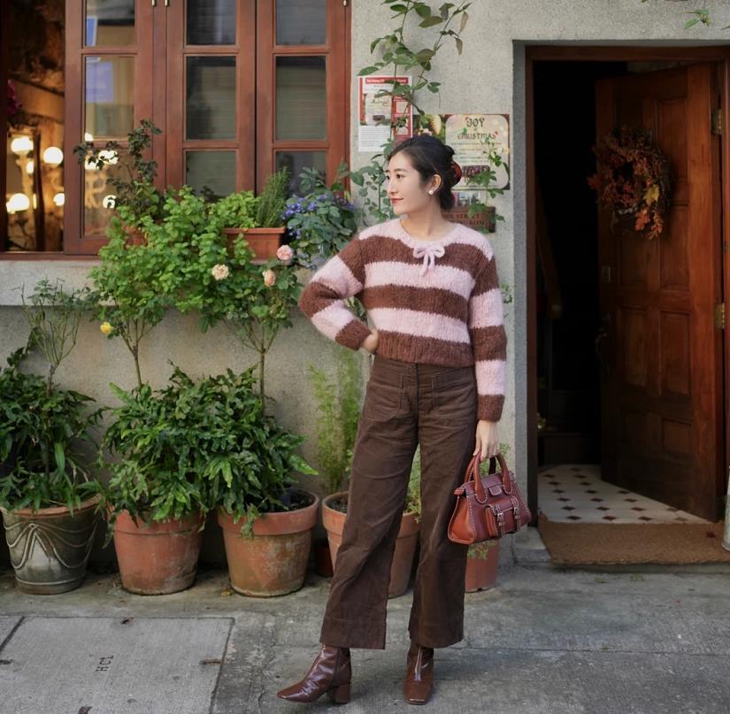 嘻嘻,粉咖配色隨便穿也好看,這套很適合日常出門的穿搭,這個粉色的針織衫可不是很死亡的顏色,稍微會暗一點,搭配咖色長褲,好看炸了。