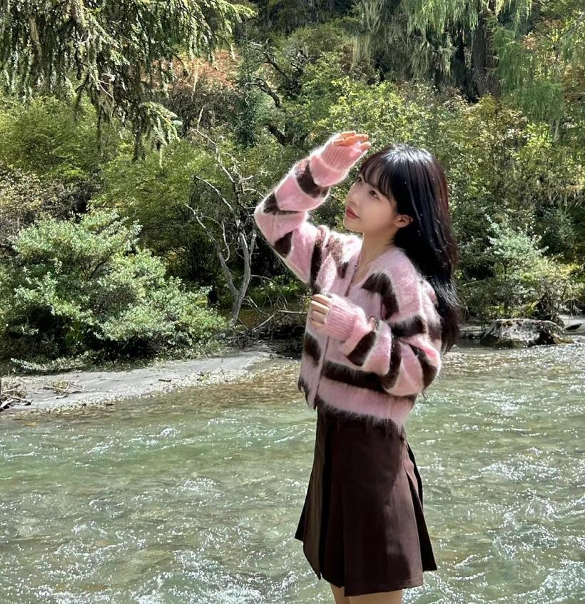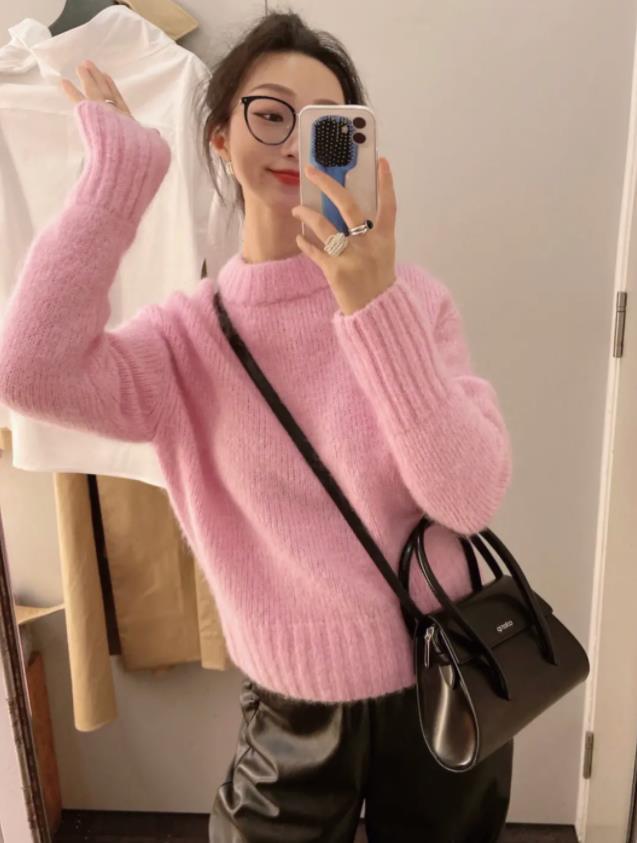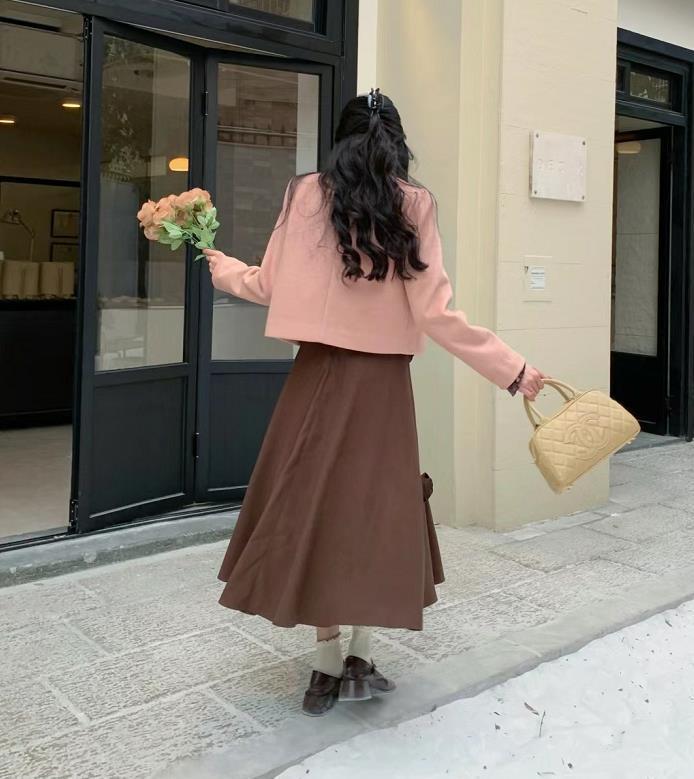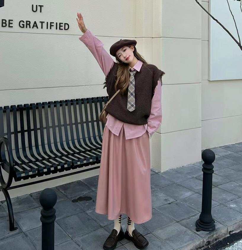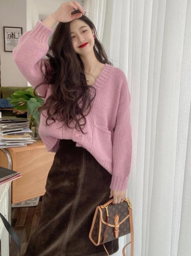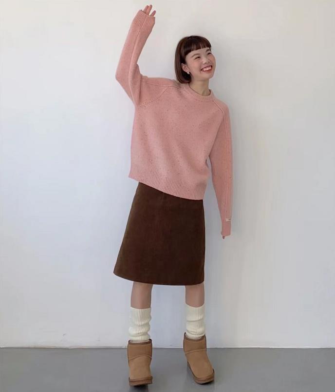 粉粉嫩嫩的少女感穿搭,這一身看起來就太喜歡了,基礎款粉色毛衣,很不挑人穿,與咖色半裙結合,好看極了。