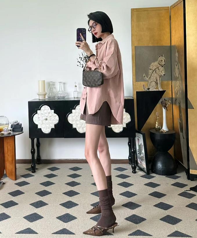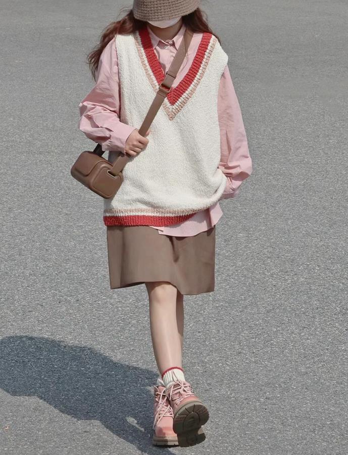 春天到了,溫度也隨之回升了不少,襯衫這件單品也可以單穿起來了,粉色襯衫+咖色馬甲,這疊穿組合絕了。