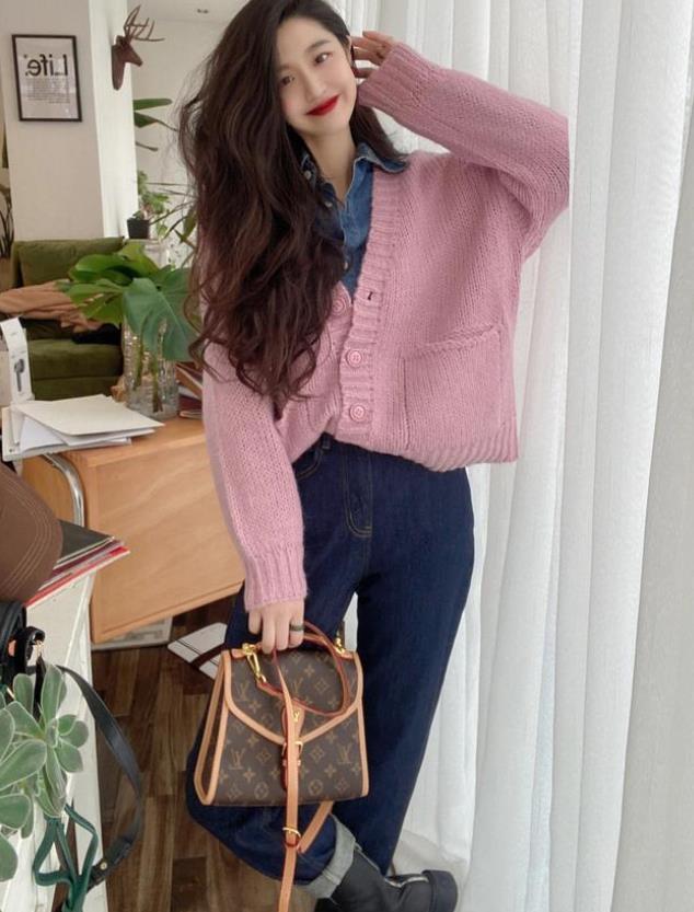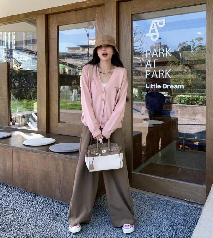 早春的粉咖配色,看起來就很溫柔美好,短款粉色針織開衫+咖色休閒長褲,上短下長,能很好優化整個身材比例,對於個矮女生來說最友好了。