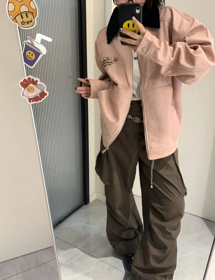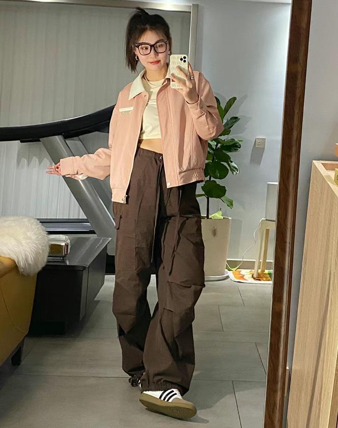 微胖女孩可以這麼穿一下哦,咖色工裝褲,有點復古又時髦,寬鬆的褲型,讓你穿得舒適又自在。選擇粉色短外套來配,又多了幾分甜美氣息。