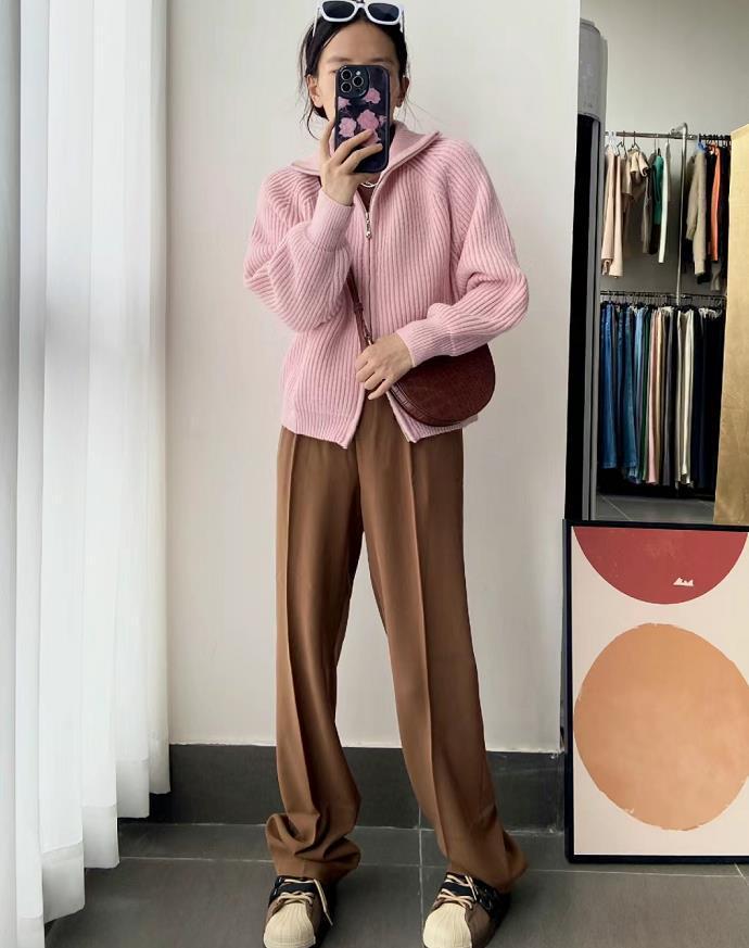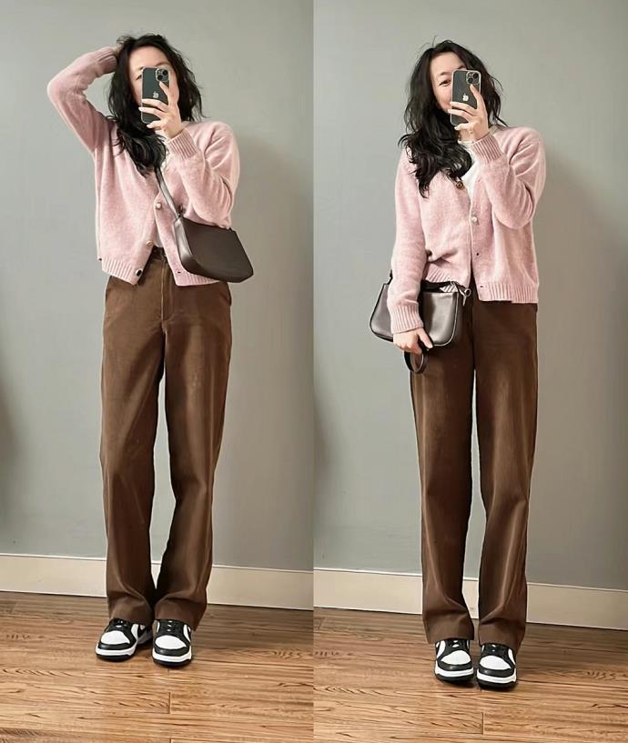 誰懂啊,粉咖配色也太好看了,淺粉色毛衣+咖色直筒長褲,這種褲型對於身材包容性真的很高,顯瘦藏肉效果絕了。