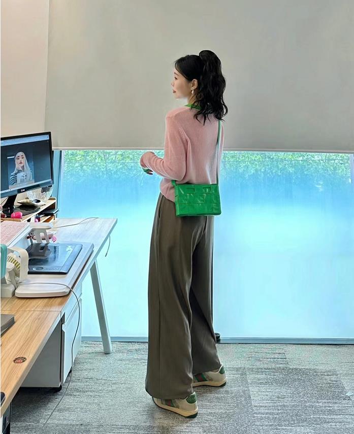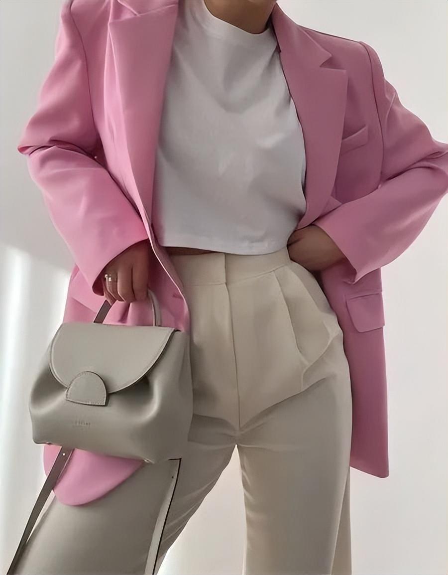 是溫柔又浪漫的粉咖配色,真的沒有想到這兩種顏色搭配在一起會那麼好看,一整個就顯得高級起來了。西裝褲穿起來非常顯腿長和腿直,建議腿粗的身材安排起來。