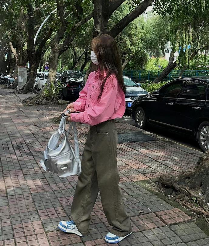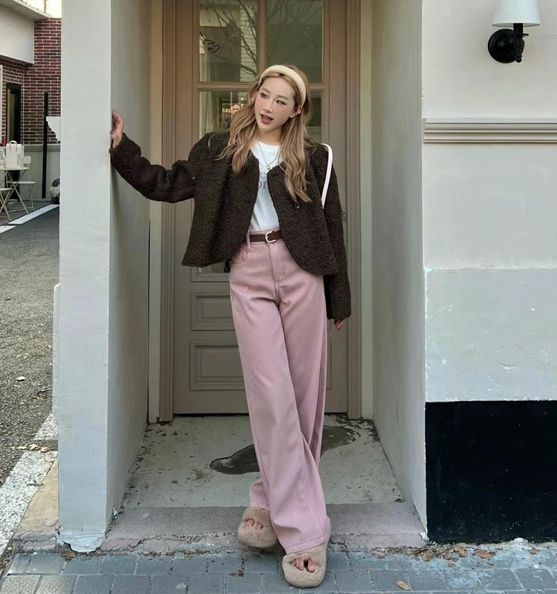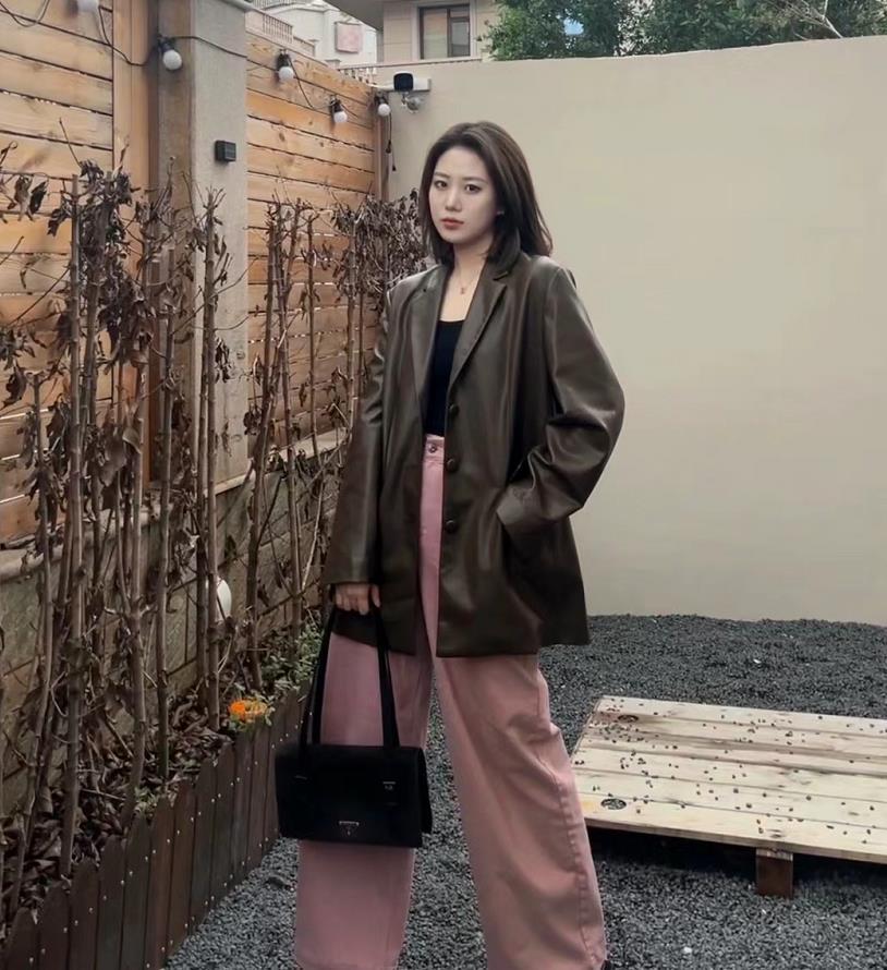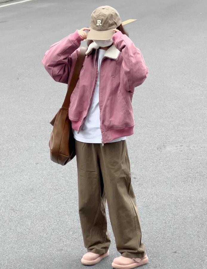 好特別的樹莓粉外套,這個顏色並不會讓你穿得俗氣,反而很顯嫩,也不失少女感。選擇咖色的休閒長褲來配,氛圍感拉滿了。