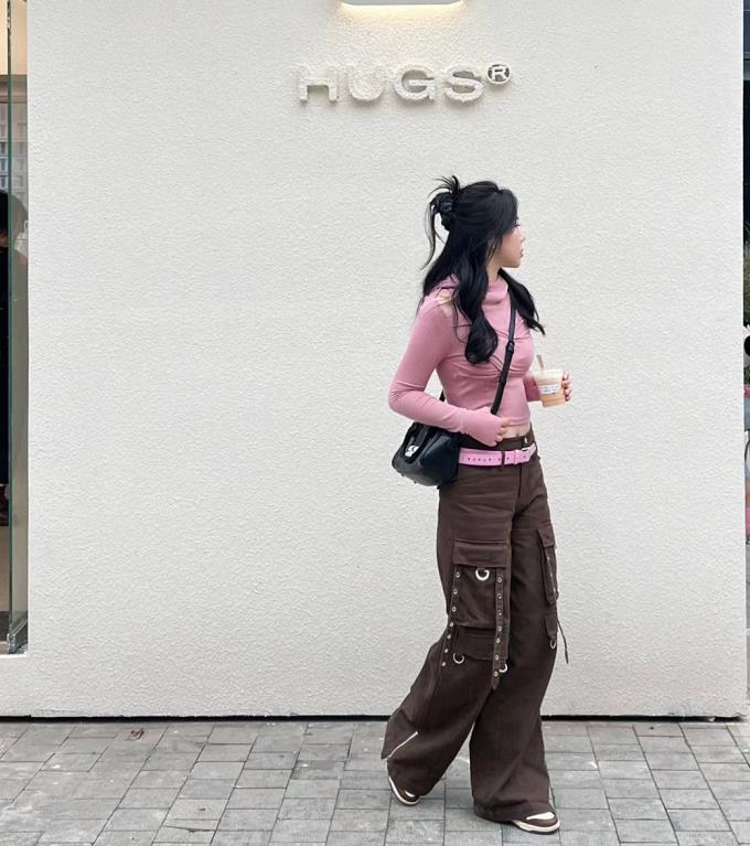 粉色和美拉德真的很配啊,修身的粉色上衣+咖色工裝長褲,又甜又酷的,上緊下松的組合,很好優化了身材比例,顯瘦極了。