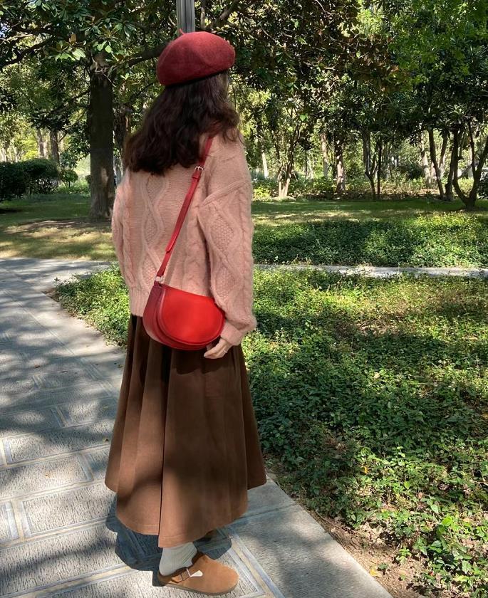 可鹽可甜的一套穿搭,藕粉色麻花毛衣,質感超好的,應對早春的溫度也足夠了。選擇一條咖色半身傘裙來配,整個着裝又多了幾分復古氣息。