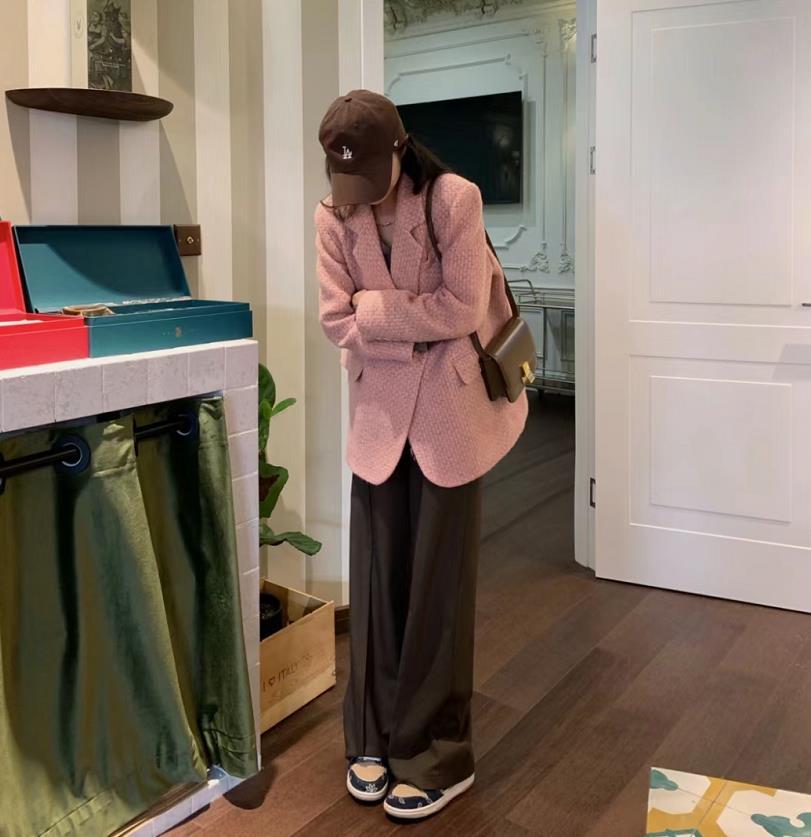 姐妹們這件粉色西裝真的可以衝,是我很喜歡的低飽和度粉色,高級又溫柔,搭配咖色休閒西裝褲,整個風格就是甜酷高級的那種。
