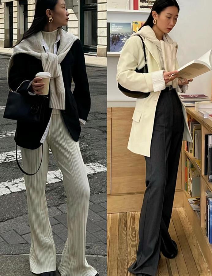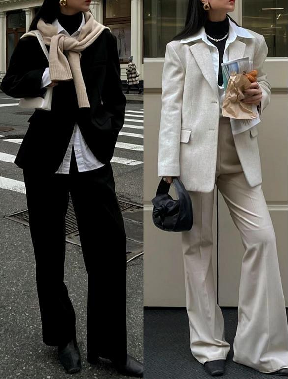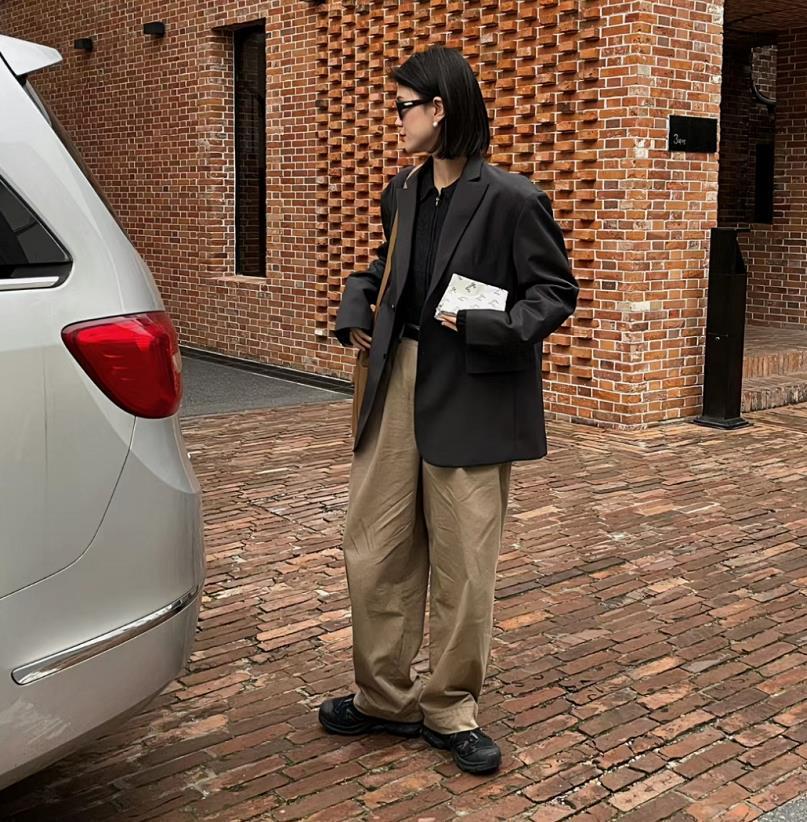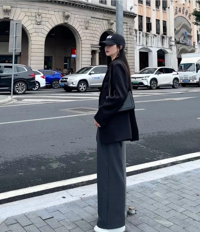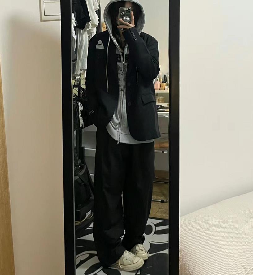 黑色西裝外套+灰色休閒西裝褲,上下都是寬鬆的版型,輕鬆打造出鬆弛感,喜歡這種闊腿版型的褲子,腿粗、不完美腿型穿起來就對了。