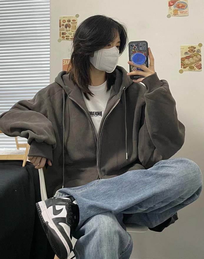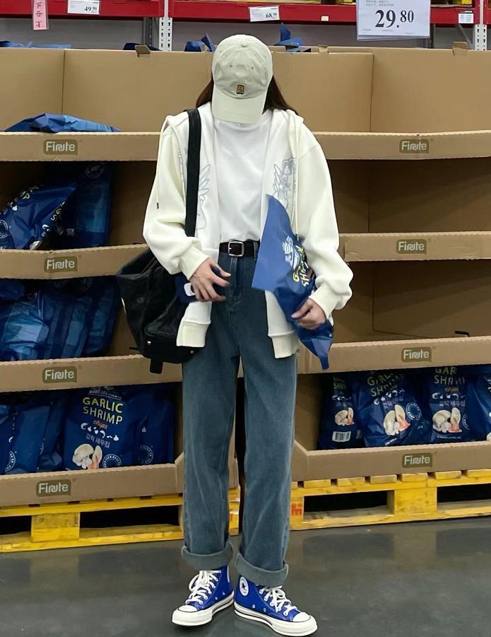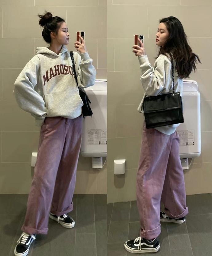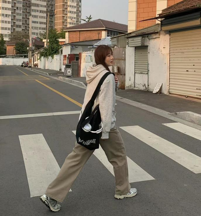 這是屬於微胖女生的韓系慵懶風穿搭,整體給人的感覺就是中性風滿滿,基礎款衛衣和休閒褲,再加上一雙運動鞋,舒適又自在。