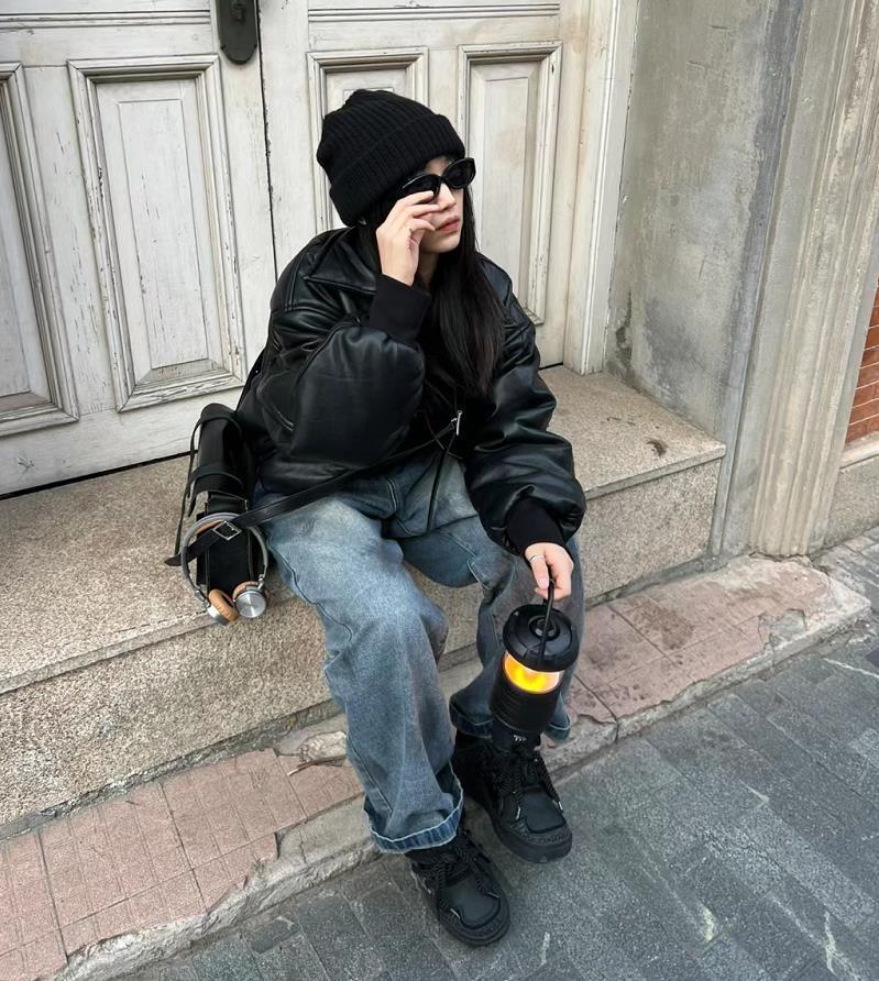 皮衣外套+黑色牛仔長褲,真的既中性,又不失酷酷的味道。