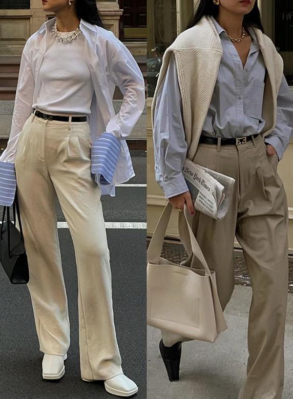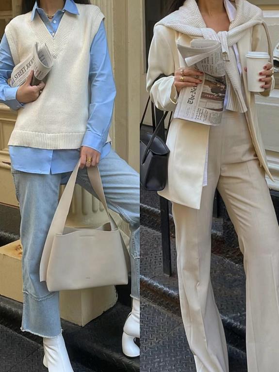 帶點慵懶感的中性風穿搭,配色有些清冷感,低飽和度的配色,覺得不夠出彩的話,可以混搭一些小面積的亮色配飾,這樣就很吸睛了。