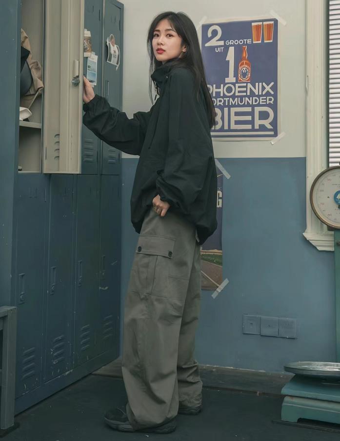 低調時髦的老錢風配色,深灰色西裝+寬鬆工裝褲,顏色的配色很簡單耐看,上下都是寬鬆的版型,真的超級藏肉顯瘦。