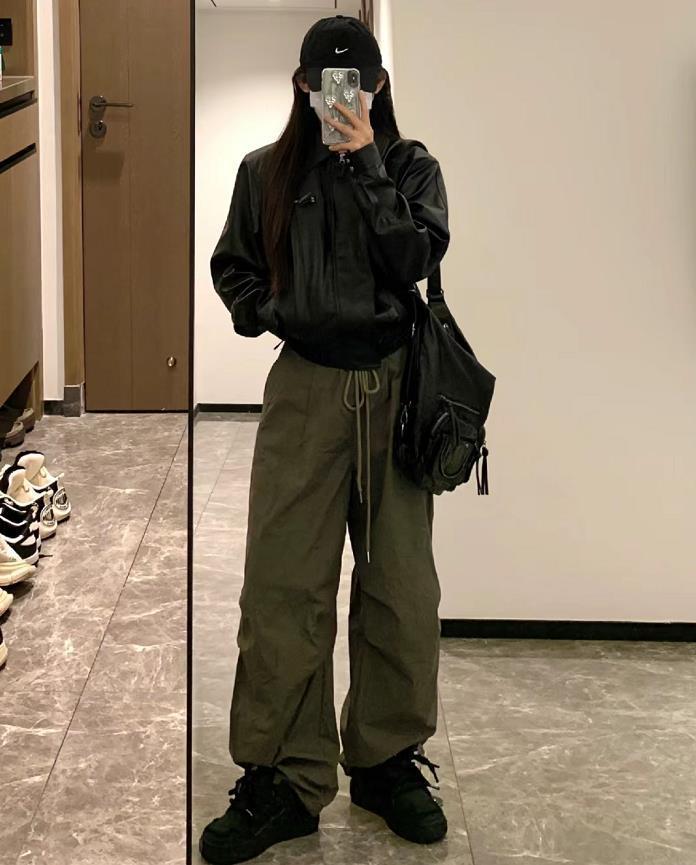 美式工裝酷感穿搭,中性風滿滿,黑色的外套,穿起來在視覺上也太顯瘦了,內搭黑色打底,瘦身的效果瞬間就飆升了。