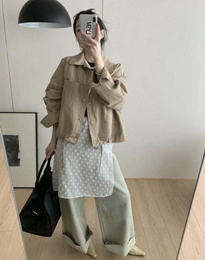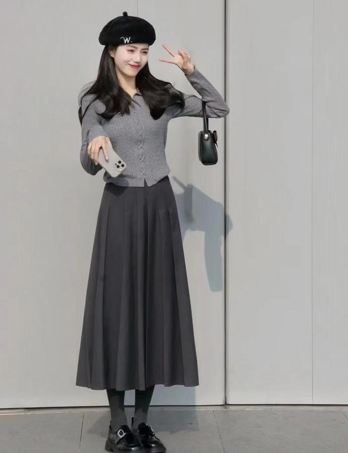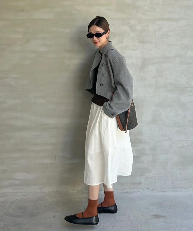 黑白灰的穿搭就是耐看時髦,短款外套+長款半身裙,上短下長,很好優化整個身材比例,腳下一雙黑色奶奶鞋,舒適又溫柔。