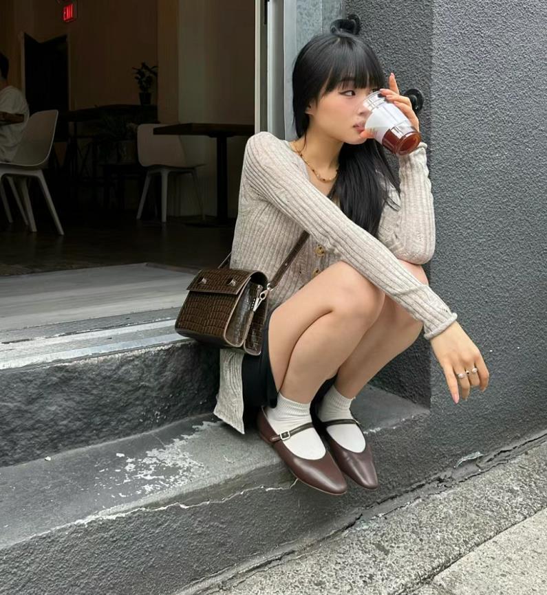 黑色的平底瑪麗珍單鞋,穿起來也太舒適自在了吧,很溫柔氣質又百搭,黑灰的配色組合,高級感十足。